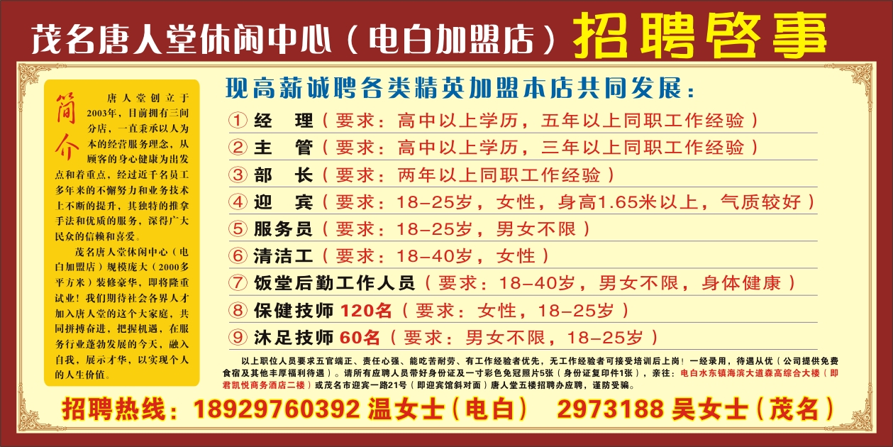 茂名唐人堂电白加盟店招聘启事