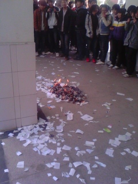 这件事彻底把大家惹恼了,晚自习时,高三所有班级开始把灯关掉,后来干脆直接去扳各个楼层的总闸刀。有人帖了大字报,说为了老师,去操场烧书示威,没成功。不过一下课,更多的纸被扔下来,漫天飞舞的白色纸片就像老师们悲凉的心情。还有人就直接把书或草稿纸用火机点着往下扔。不一会儿楼下白白的一片。