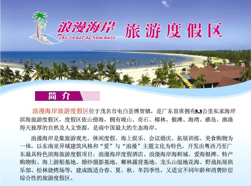 浪漫海岸旅游度假区位于电白县博贺镇龙山尖岗管理区海边,距离御水古温泉16公里,与放鸡岛景区隔海相望,交通十分便利。度假区风光旖旎,是远离都市喧嚣的“世外桃源”。浪漫海岸旅游度假区占有资源范围广阔,广东省首个拥有5.3公里私家海岸线,以东南亚风格,致力塑造阳光、大海、沙滩、椰风、花海的美景和“爱”与“浪漫”、“自然”与“动感”的氛围,以“爱”与“浪漫”为文化底蕴,并弘扬“爱”与“浪漫”主题景区。开发经营项目主要有度假酒店、会议中心、浪漫别墅、海鲜城、沙滩摄影基地、沙滩休闲吧、特产购物街、爱海银滩、海水浴场、松林烧烤场、汽车营地等。现因需要急聘以下岗位: