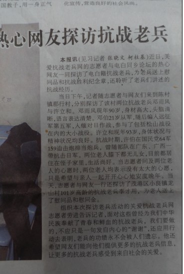 蛙子 说: 转志愿者张先生的贴 2011年5月1日探访茂名老兵 。。。。。。再过5年,恐怕抗战老兵就会像稀缺资源一样,想找个面对面说话的人,都是一种奢望了。。。。。。</span> 历史不会忘记他们,中华民族不会忘记他们!!! 点击展开...