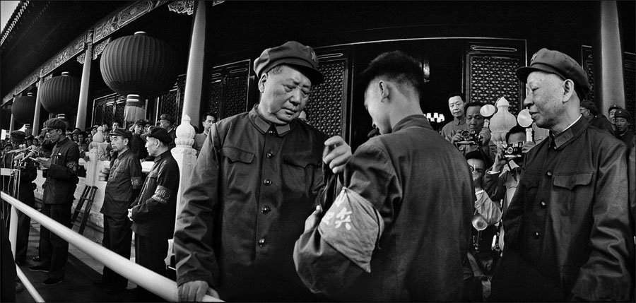 1966年8月18日,毛泽东首次在天安门接见了红卫兵,由此掀开了红卫兵运动,文革初期,毛泽东8次接见红卫兵,接见人数超过了1200万。(来源:凤凰网历史)图为红卫兵小将正在为毛泽东带袖章,其他领导人均已带上袖章,唯独刘少奇未带。右四为林彪,右五为周恩来。