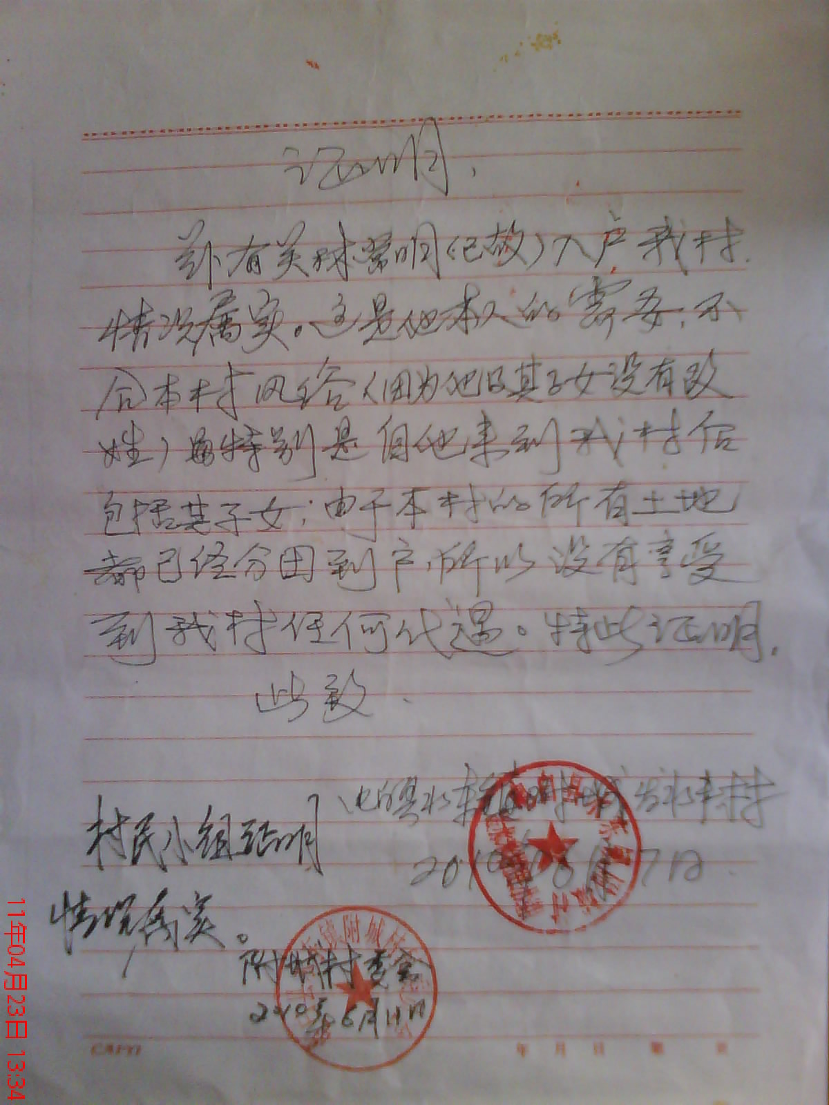 任由我找哪里,都没的一个结果,一拖再拖,又过了几个月,在2010年11月15日那贞社区土地补尝款第二批款分配,在当天,信访局再次出面调解,叫村民在信访局开会调解,村民再次提出要调查我的证明,且要求我写下保证书,保证我是在户口所在地未分配田地,也未分过补尝款才给我家分配那贞社区的补尝款,如果调查出我的证明是假的,要我承担他们调查费用,当时我不知就这么一事还能有什么费用,落实后,调查费用有,误工费、油费与调查人员当天吃饭费用。清楚后,我给他们写下这份保证书,也要求他们调查必须信访局主任在场,调查时间为2010年11月15日至2010年11月30为止。当天调解就到此。