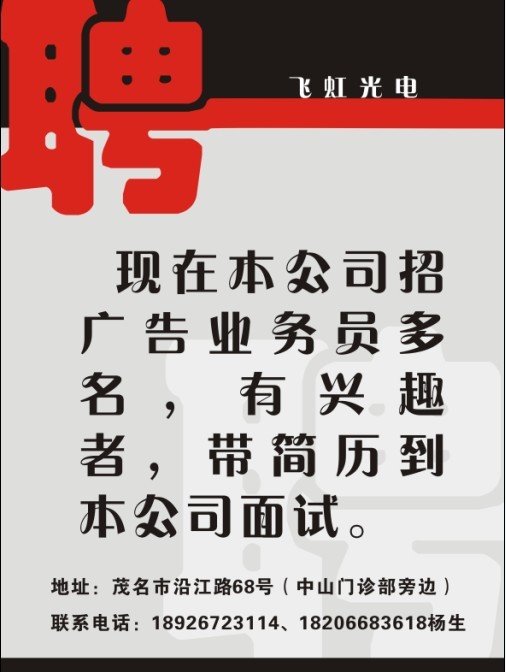 Y ygp841130 学前班 注册 2010-05-13 消息 32 反馈评分 0 点数 0 2011-06-08 #1 公司现在招聘广告制作男学徒,待遇:1000元/月,上班时间:8:00-12:00、14:00-18:00。一个月休息两天,不包吃住。联系电话:18926723117/15917115014 陈小姐 附件 未命名1.jpg 60.4 KB · 查看: 291 未命名.jpg 134 KB · 查看: 309