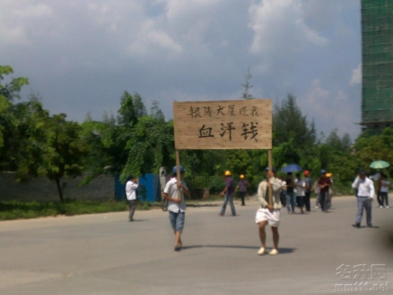 今天下午14时,位于茂名电白县城水东镇海滨大道的银涛大厦(茂名银涛房地产开发有限公司),建筑工人们集体游行讨薪,听说银涛大厦老板拖欠工人们三个月工资(六十多万)还没支付,工人们中秋节也没钱回家过节,今天一大早再次到工地讨薪无结果,集体游行讨薪。