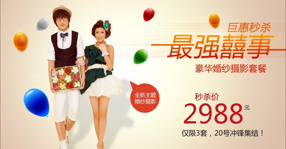 本年度首次推出豪华婚纱套餐秒杀~ 以最优惠的价格拍最满意的婚纱照!