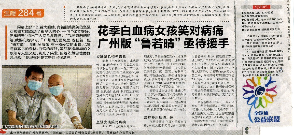 <<新快报>>2012.6.15(A)29" 天天公益"版 登了海燕求助文章,恳求更多社会有心人士关爱海燕.下图是报纸截图!