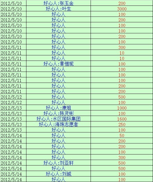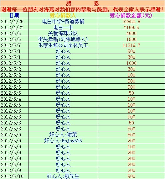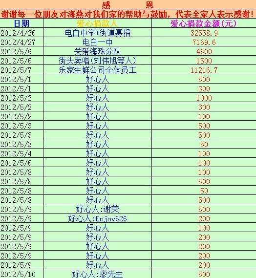 到5月14日为止,收到大家为海燕捐赠的善款是74165.2元,捐款的明细如下2图,谢谢,谢谢大家...