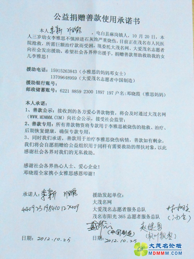 小雅思的妈妈邓晓霞女士委托大茂名感恩所有关注、帮助援助小雅思烧伤的社会各界,目前捐赠款已达到223400元。小雅思的初期手术工作已经启动,将在下周择日手术。同时,并将严格履行求助之时的善款使用承诺。确保善款的公开,正确使用。如有盈余,将捐赠社会公益帮助他人回馈社会对其的帮助。