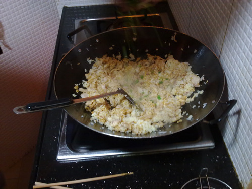 先去朋友家吃个饭,此君发达前还游水过香港当过厨师,炒的海鲜饭果然有一手,