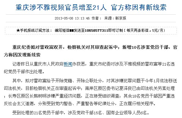 重庆涉不雅视频官员增至21人 官方称因有新线索