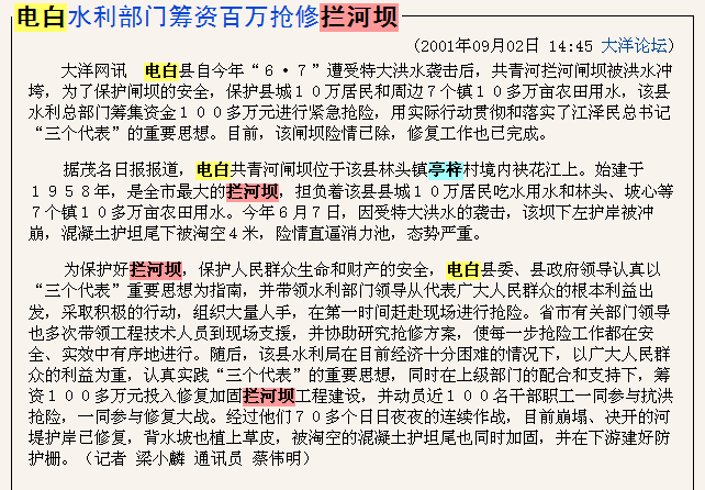 孔 孔子老婆 荣誉会员 荣誉会员 注册 2007-10-16 消息 8,932 反馈评分 492 点数 191 2013-08-16 #27 电白共青河闸坝位于该县林头镇亭梓村境内袂花江上。始建于1958年,是全市最大的拦河坝,担负着该县县城10万居民吃水用水和林头、坡心等7个镇10多万亩农田用水。