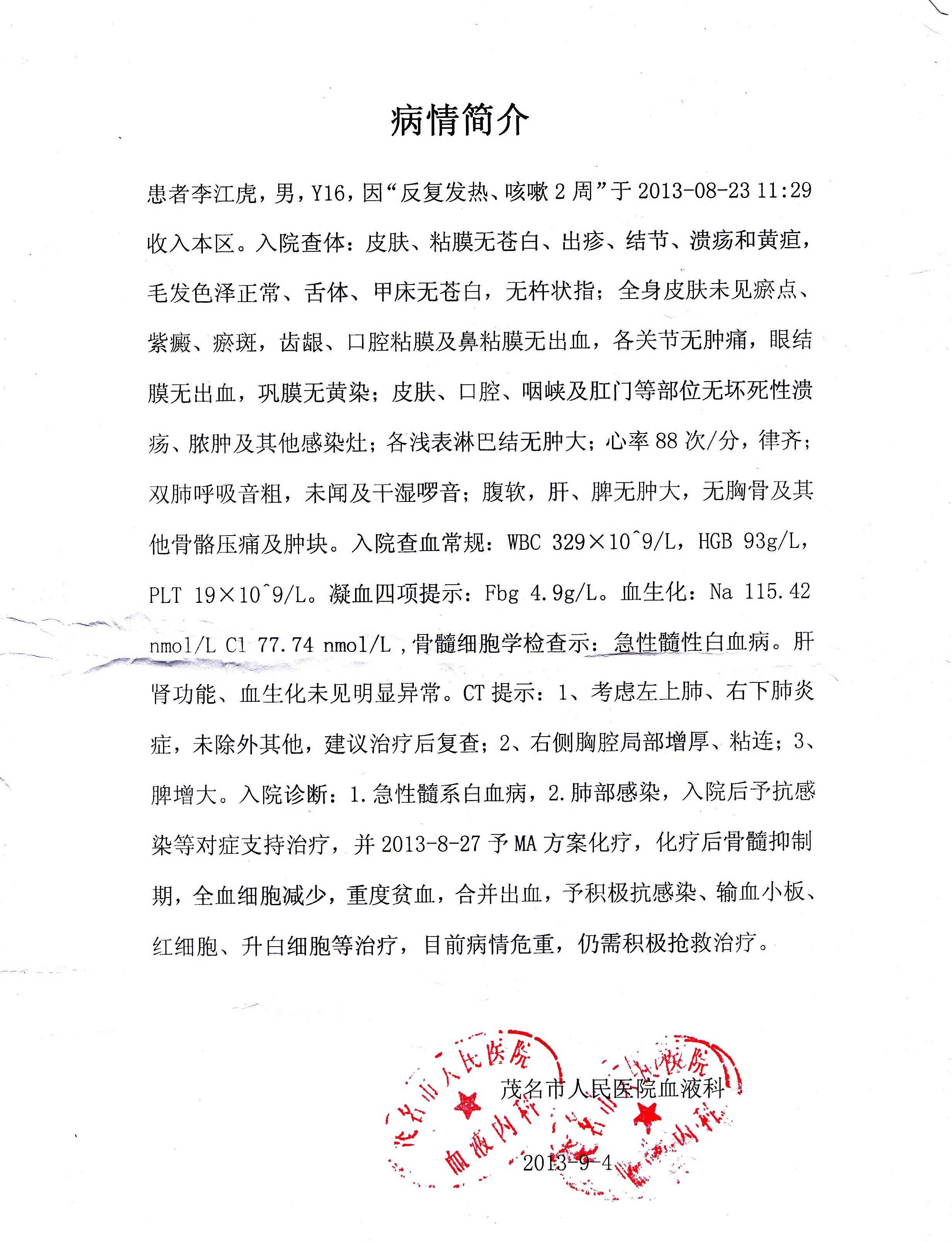李江虎,电白县霞洞镇下岭高车村人,电白第三中学初三(8)班学生。一个月前被诊断出患急性白血病,现留医于茂名人民医院6号搂6层血液科5号床。目前病情危重,正在抢救治疗。李家父母均为农民,靠打短工维持生计,收入极不稳定,日子可谓艰难。现在,白血病这座大山更是将李家压得风雨飘摇……