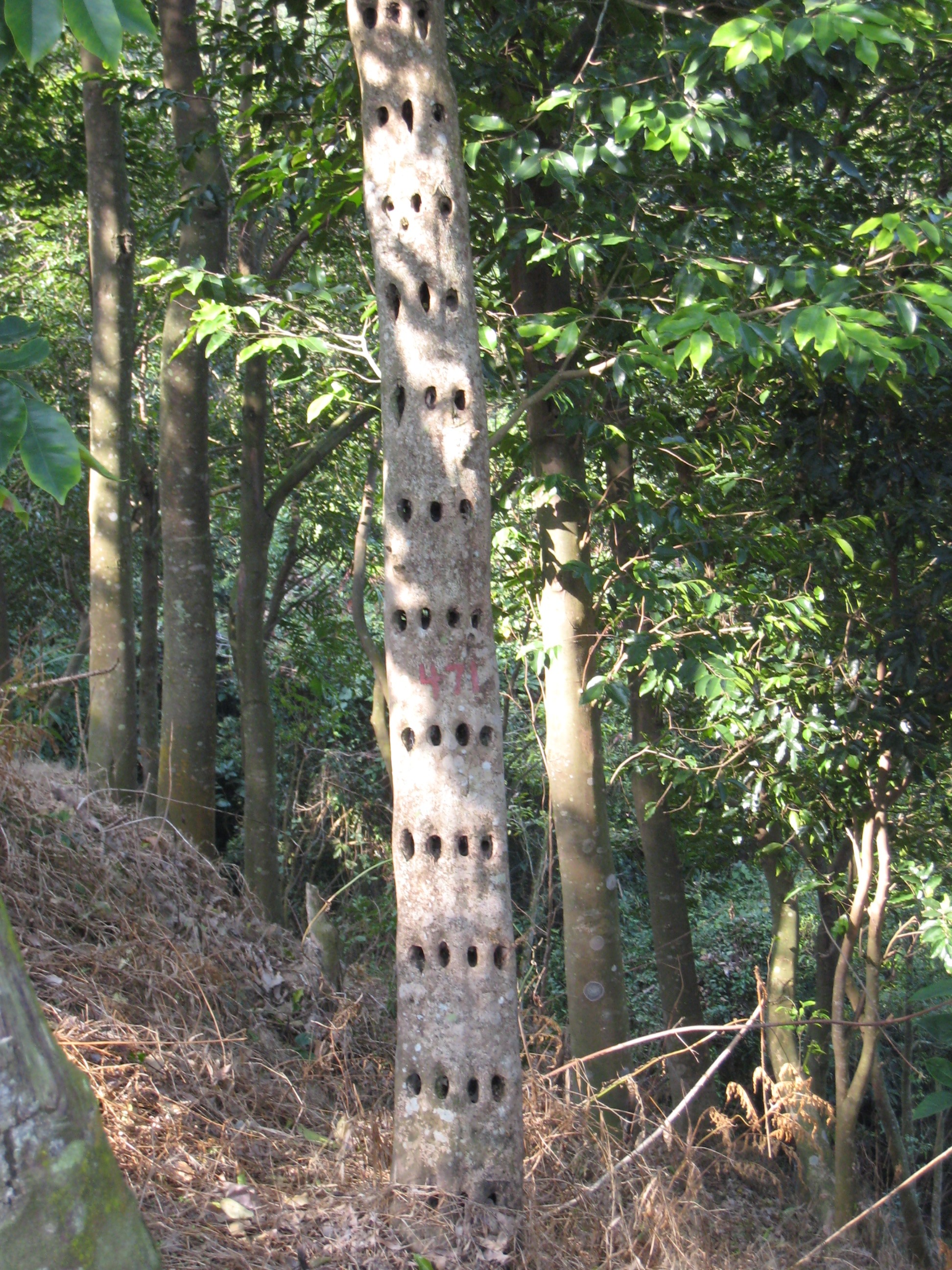 山上的沉香树虽有几百万株,但种植时间都还不算长,适宜人工结香的树不多。当看到这几株已被人工结香的树时,我很难描述自己当时的心情。这样一棵树,主干不到两米的距离上就有约50个穿透身体的洞;这样一棵树,本长得好好的,却惨遭截断,没了脑袋;这样一棵树,给削了皮,割了肉,只裸露一点筋骨颤抖于寒风之中。因为受了伤,它才能结香。就像人工养殖珠贝一样,给贝一粒沙,让它疼痛,让它流泪,让它把沙变成珍珠。这与养鸡养鸭养鹅不一样,鸡鸭鹅活着的时候,可都是让人们供着养着的,有病就喂药打针,天冷就保暖加温。但是种沉香树,就是要让它痛苦,因为它痛苦了,才能结香,结香了,才能变成钱。