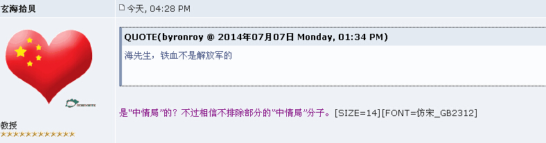 玄海拾贝 教授 注册 2010-07-14 消息 3,523 反馈评分 2 点数 61 2014-07-07 #26 QUOTE(宇宙细胞 @ 2014年07月06日 Sunday, 05:00 PM) 楼主不是被“硕士”的文章气死了?离奇的失踪令人废解! [snapback]3666377[/snapback] 笑话了!鄙人怎会被一个江湖小丑气死?原因是美国间谍封杀了鄙人的ID。