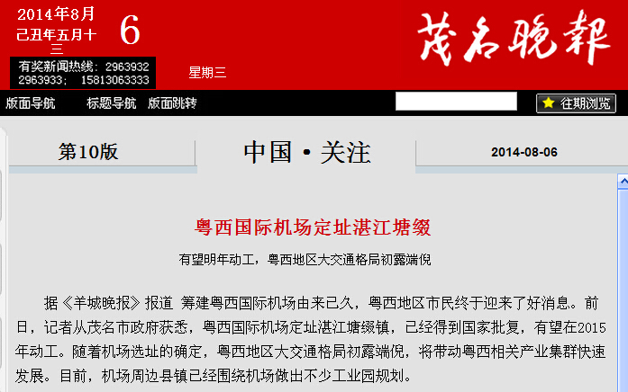 这是毫无职业操守的羊城晚报记者杜撰的假新闻,事实今年七月广东省发改委才上报国家民航局,但国家民航局并未批复,此新闻不但杜撰说国家已批复,很多内容也是抄袭网友的内容而来,如“茂名市民可以通过207国道从汕湛高速石鼓互通上高速直达机场”,明显就是张冠李戴乱套用一个高州网友之前讨论的内容。