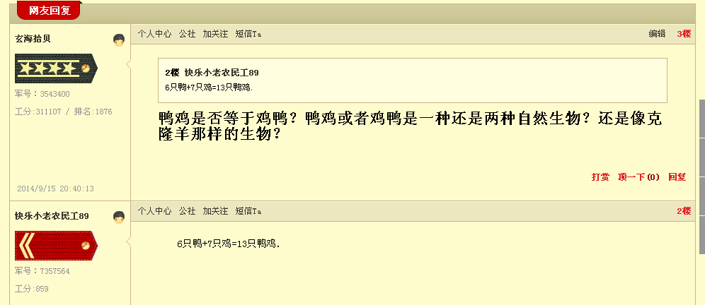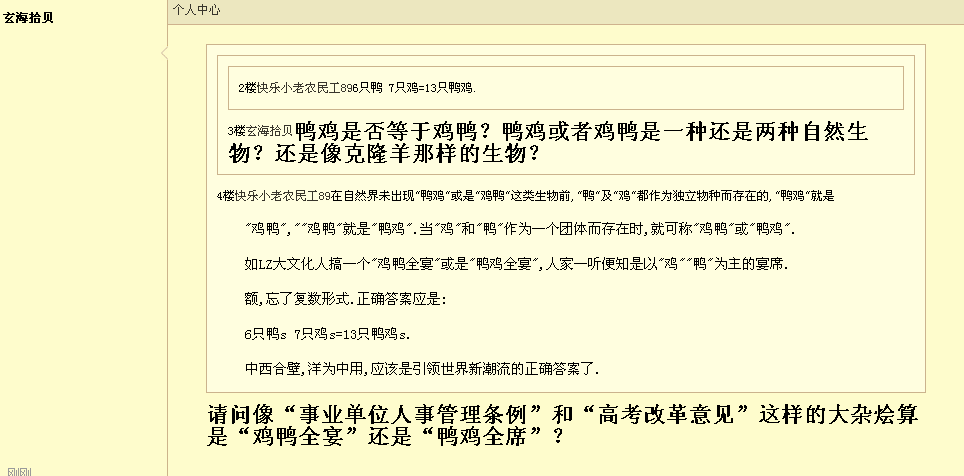玄海拾贝 教授 注册 2010-07-14 消息 3,523 反馈评分 2 点数 61 2014-09-29 #20 QUOTE(东澳夕照 @ 2014年09月25日 Thursday, 02:46 PM) 老汪是茂名著名诗人,不是评论家,海公公什么出路他搞不懂,海公公逃出秋林的情景他倒会作两首诗描述一下。 [snapback]3701455[/snapback] 换马甲不麻烦么?