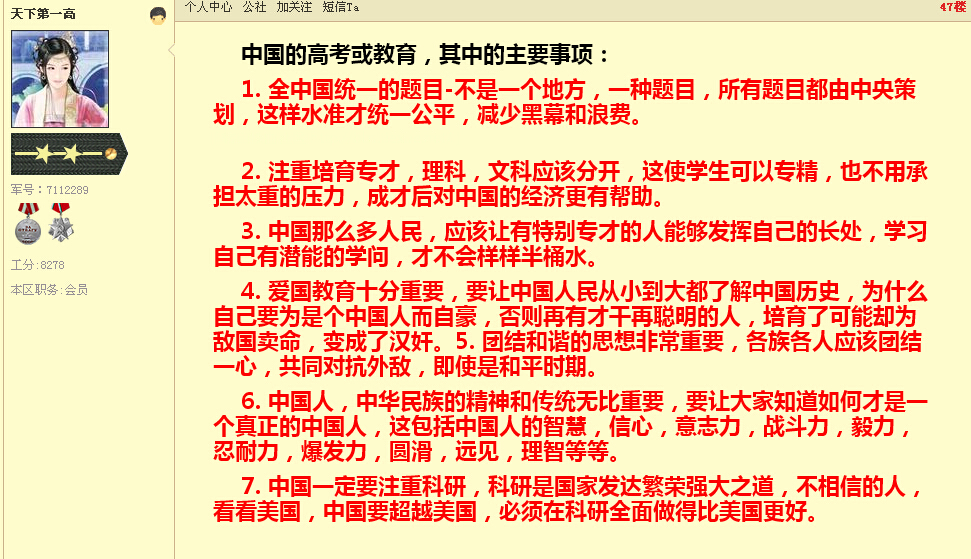 玄海拾贝 教授 注册 2010-07-14 消息 3,523 反馈评分 2 点数 61 2014-09-17 #6 QUOTE(流韵 @ 2014年09月15日 Monday, 09:32 PM) 海前辈半出江湖。 江湖习 性不改。 [snapback]3698208[/snapback] 谈论中国高考的走向也算“江湖鬼道”?你不要混淆了“正道”与“邪道”的概念了!电白论坛不是有许多人自诩“教育行家”或者“关心教育”的人么?怎么不敢在此撒野了?