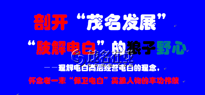 “茂名发展”睁眼瞎的师爷们,你们看清楚了吗?电白需要你“茂名发展”来拯救吗?你们“茂名发展”有当电白“救世主”的本事吗?“茂南区”与“茂港区”在你们“茂名发展”的英明“哺乳”下可有电白的样子?回家照照镜子再来吧!