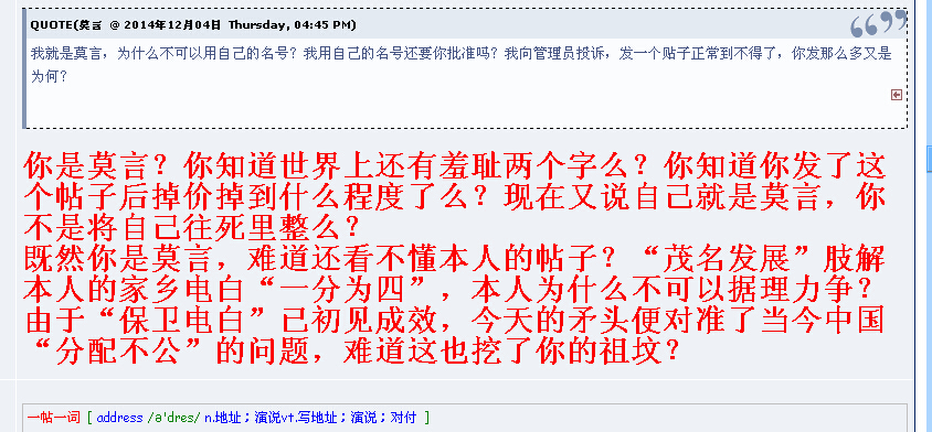 初悟人生 大学三年级 注册 2010-07-13 消息 858 反馈评分 0 点数 0 2014-12-06 #75 QUOTE(莫言 @ 2014年12月06日 Saturday, 04:36 AM) 你还有什么不敢用的?像你这种不要脸的人。 [snapback]3720431[/snapback] 世界上还有谁像你这样无耻?如果你称第二,谁还敢称第一?看看你自己毫无羞耻的说辞吧! [attachmentid=335461] 附件 莫言的海口夸大了!.jpg 513.6 KB · 查看: 301