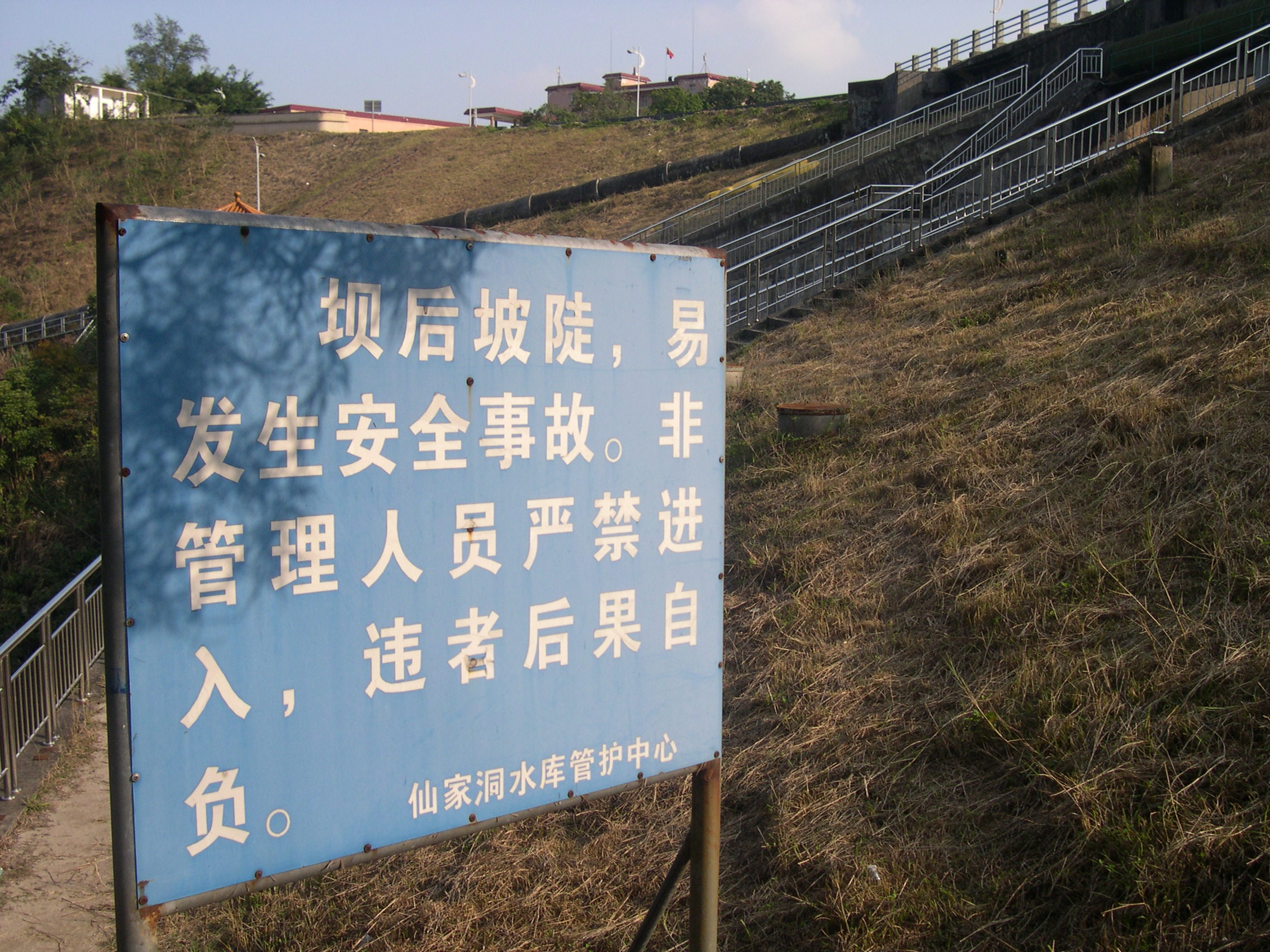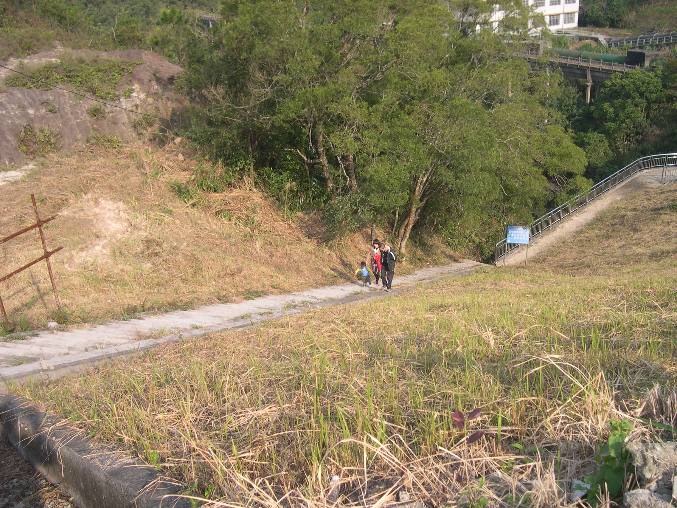 从这个水泥阶梯走下去就是输水涵洞出口和溢洪道拉闸口,告示牌后面那一段阶梯很陡,虽装有扶手栏杆,走起来还得小心翼翼