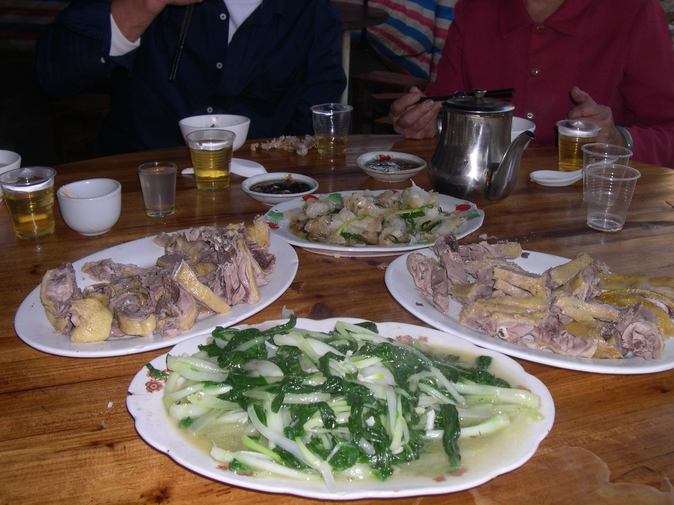 大约是路边店的缘故,客人不多,菜式不多,弄来弄去也就鸡鸭鱼几样,我们随便点了半边白切鸡,一个即即炒的老填鸭,一份豉汁蒸鲩鱼,一个杂菜煲和一份猪杂枸杞汤,吃完饭继续前行。