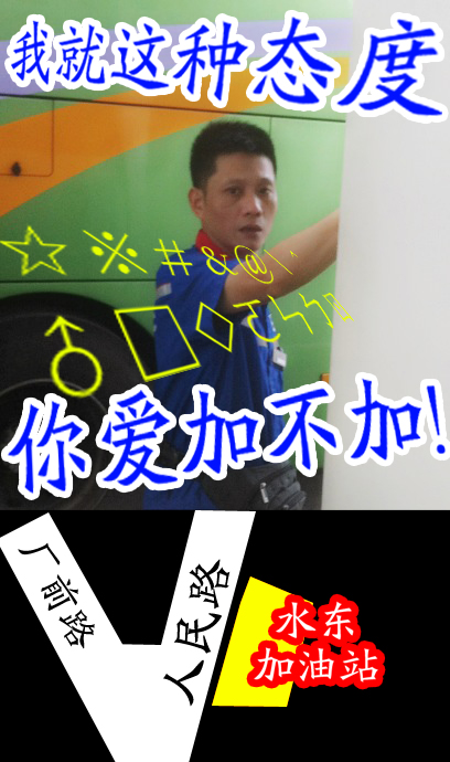 水东加油站:上个月我开了工地的破烂车去水东加油站(瓷厂路口对面那家)加油,工作人员问我加多少,我说150,说了两遍,不知道是他天生耳背还是刚和老婆吵完架,他竟去给另一台长途客车加油了。我开始还不知道怎么回事,但是等他加完后,还没轮到我,一直到第四个,我问什么时候给我加,他倒连骂带说的说刚才问我的时候我没说加多少……我答道:我说了呀,什么态度嘛?他就说:“我就这态度,你爱加不加……!”天啊~ 我无语了,不知道为什么这么有名气的加油站,服务人员竟这么没素质……