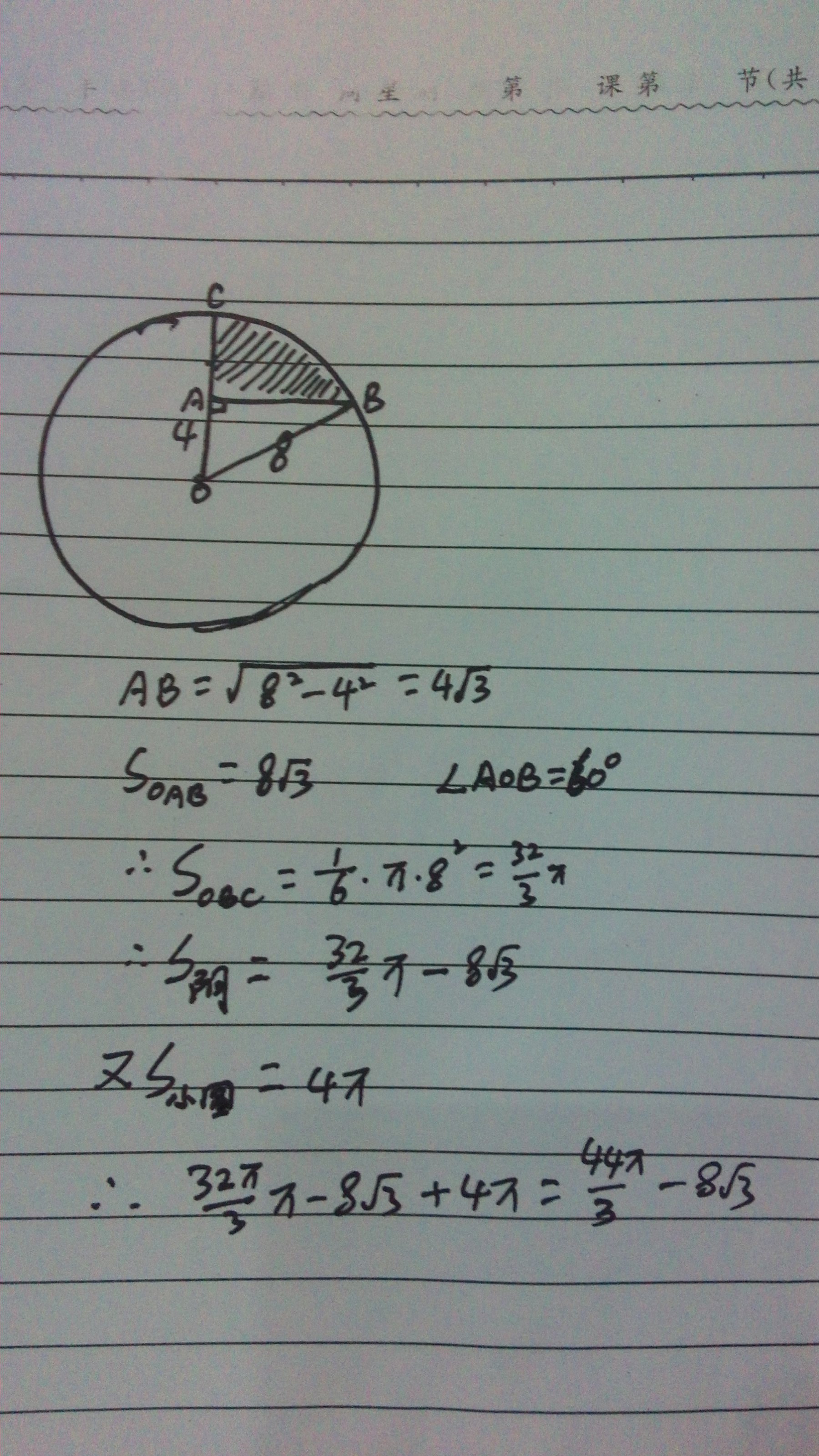 电 电城屠夫 大学三年级 注册 2012-04-20 消息 850 反馈评分 4 点数 1 2015-06-15 #35 QUOTE(喜大普奔 @ 2015年06月14日 Sunday, 03:38 PM) 哈哈,也来搞死些脑细胞 画个图 如图所示: 作虚线AH,AH即是大圆直径为 8cm。直角三角形AEH中,边AH是边AE的两倍,这是个特殊三角形,得出角A为60°。 边长AE=4cm, 边长AH=8cm 根据勾股定理 EH²=AH²-AE²=8×8-4×4 得EH=4√3≈6.92cm △AEH的面积=4×6.92÷2=13.84cm² 扇形ABH,根据扇形面积公式 S=nπR²/360 =3.14×8×8×60/360≈33.49cm² 大圆内的阴影部分=33.49-13.84=19.65cm² 小圆阴影面积=πR²÷4=3.14×4×4÷4=12.56cm² 整个图形阴影面积=19.65+12.56=32.21cm² [attachmentid=340989] [snapback]3758781[/snapback] 正确。谢谢!
