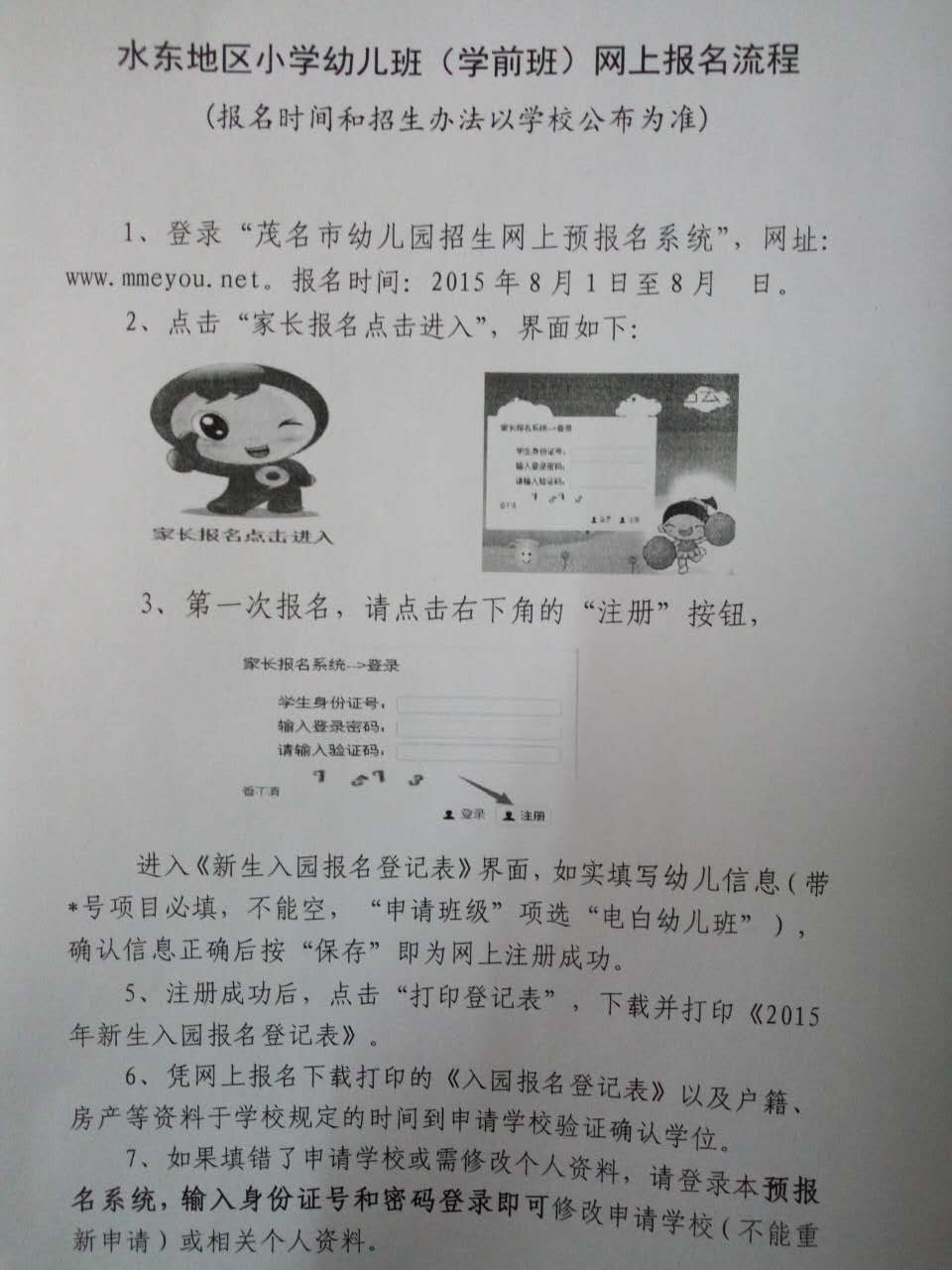华 华灯璀灿 小学一年级 注册 2015-03-26 消息 136 反馈评分 0 点数 0 2015-07-30 #2 QUOTE(浩大博闻 @ 2015年07月30日 Thursday, 10:00 AM) 小孩到了适龄入学后(学前班)年纪,走了无数次二小,后被告知8月1号网上报名请问网址多少?8月1号几点开始报名? [snapback]3768035[/snapback] 附件 877772171706199022.jpg 72.4 KB · 查看: 452