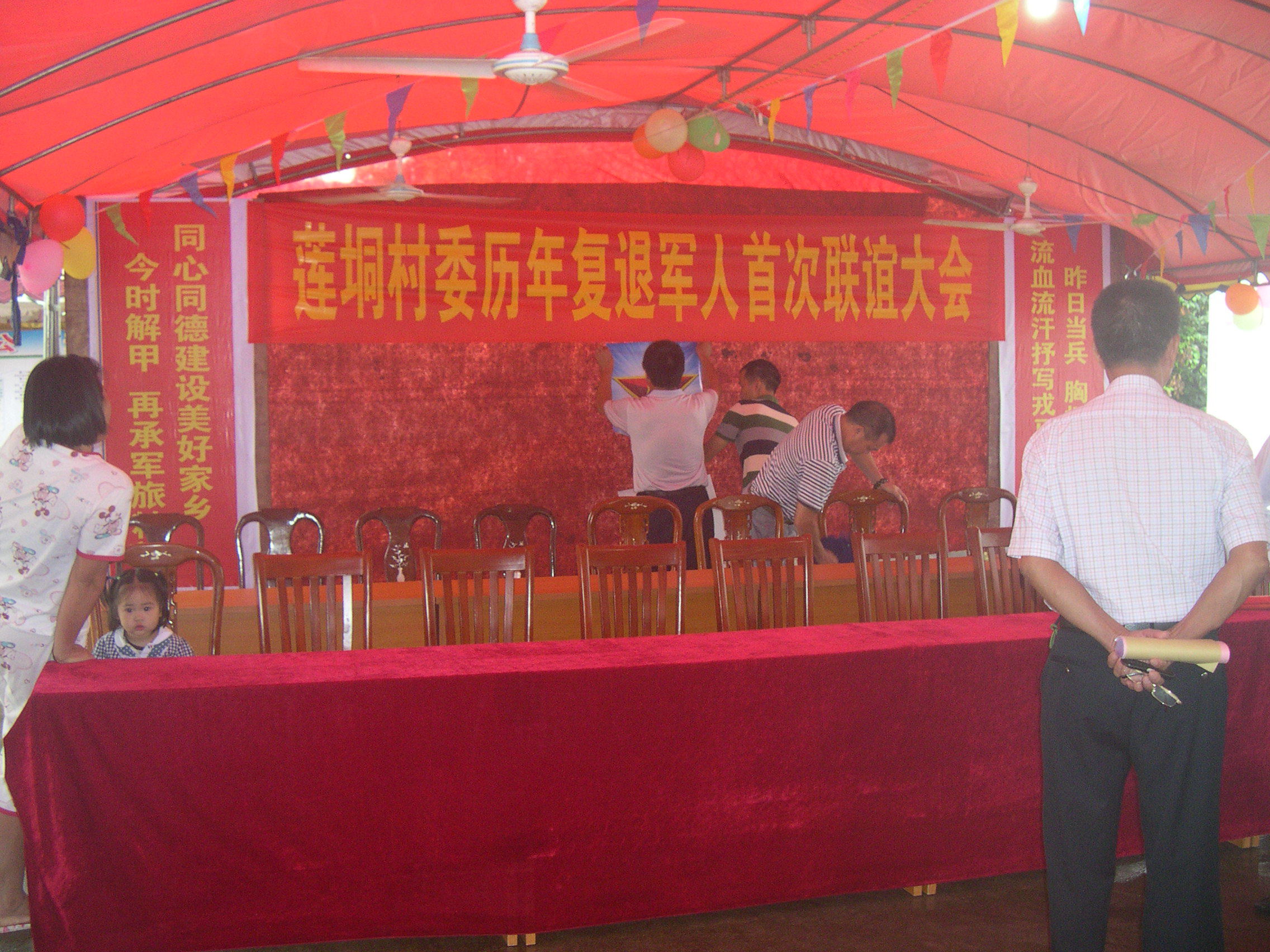 村委会干部在布置会场