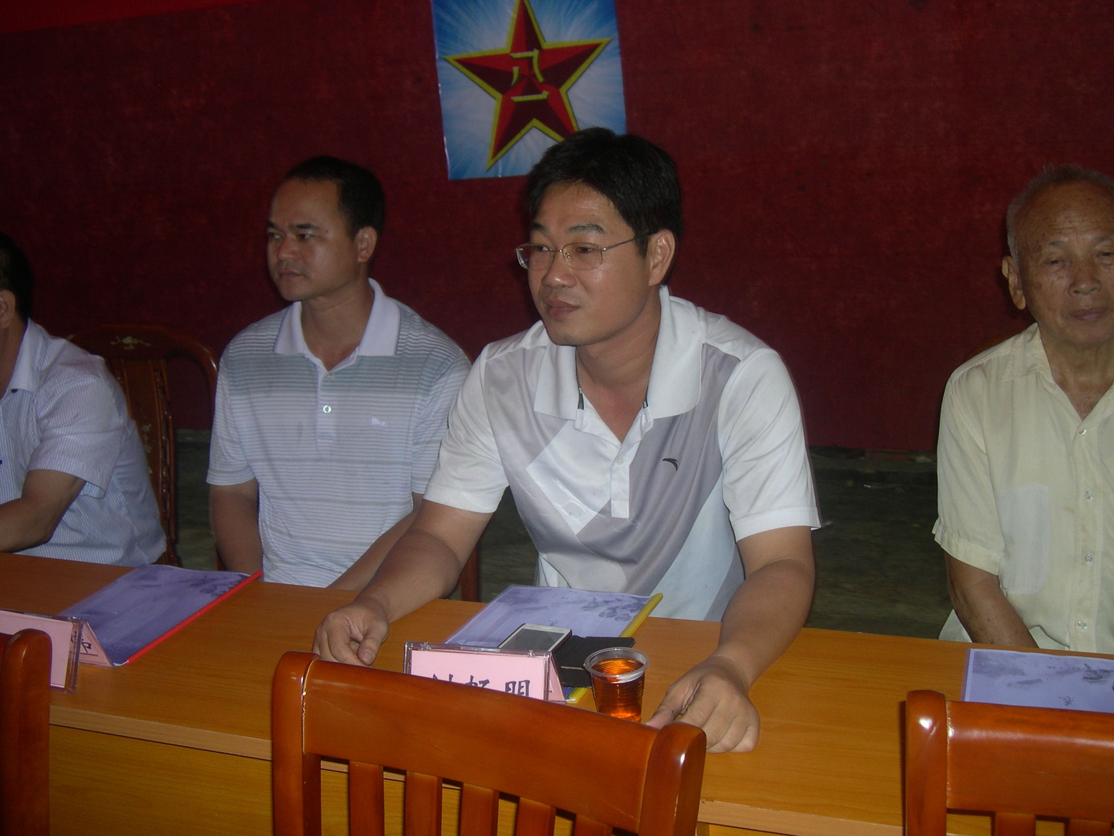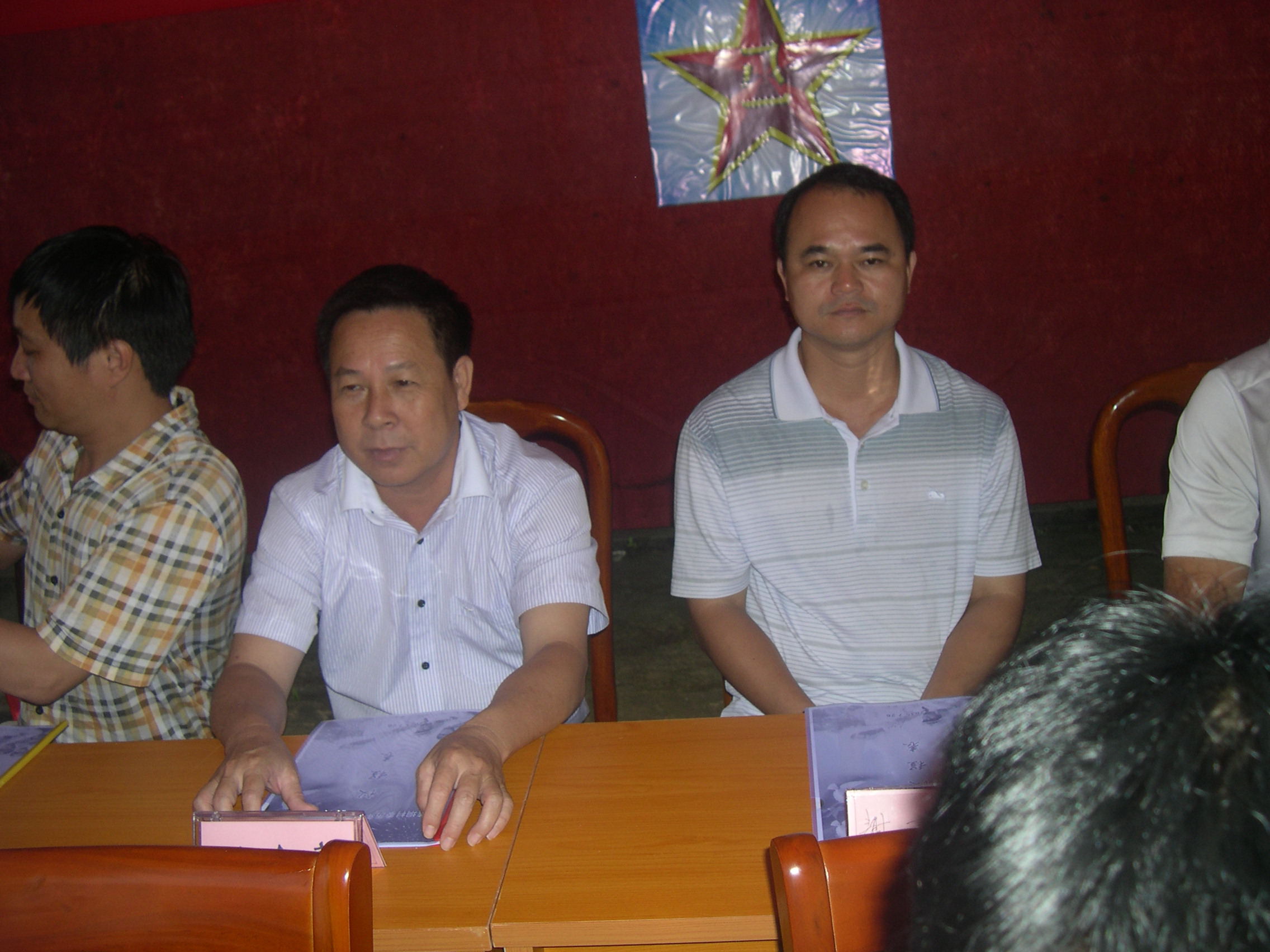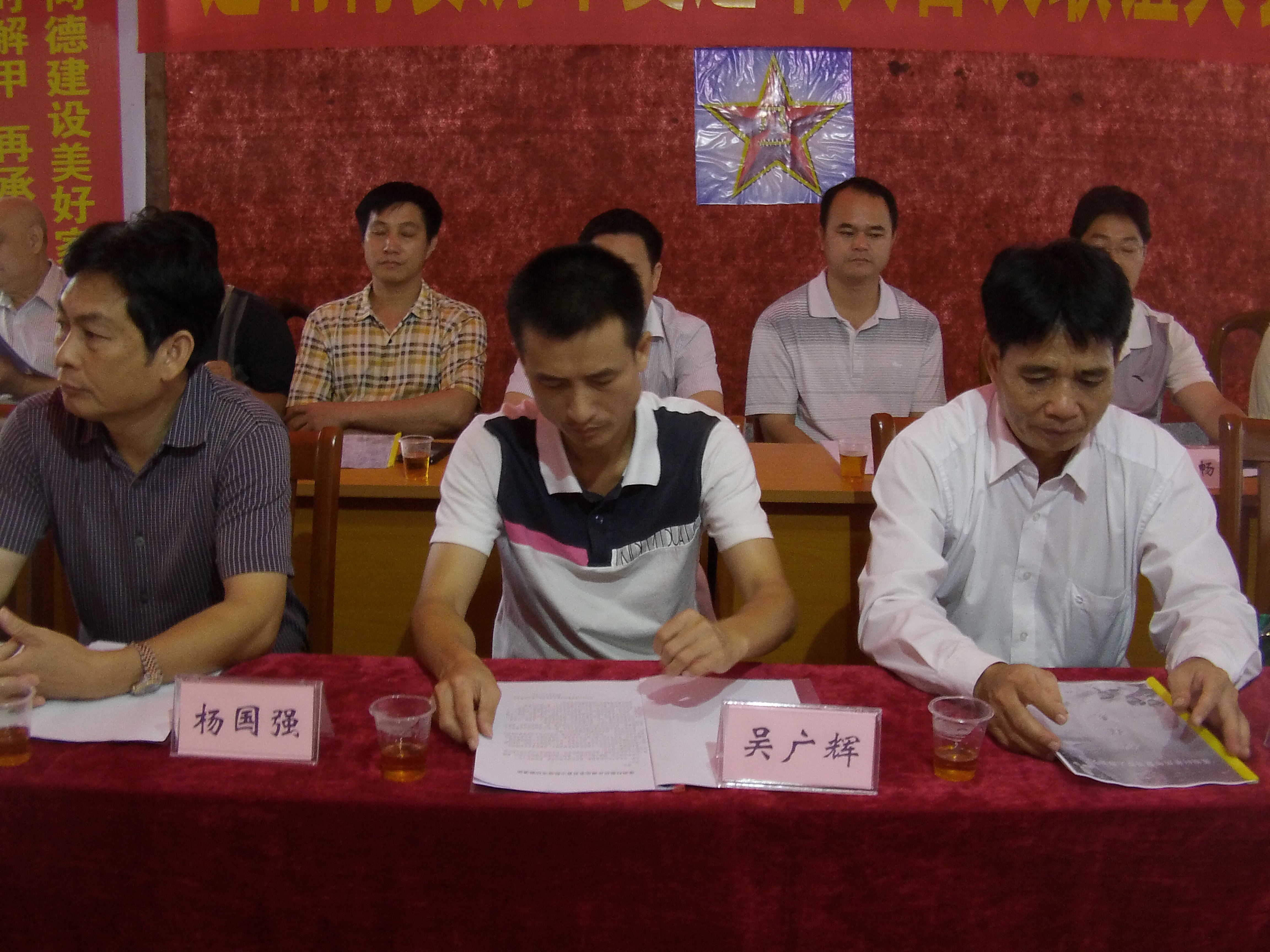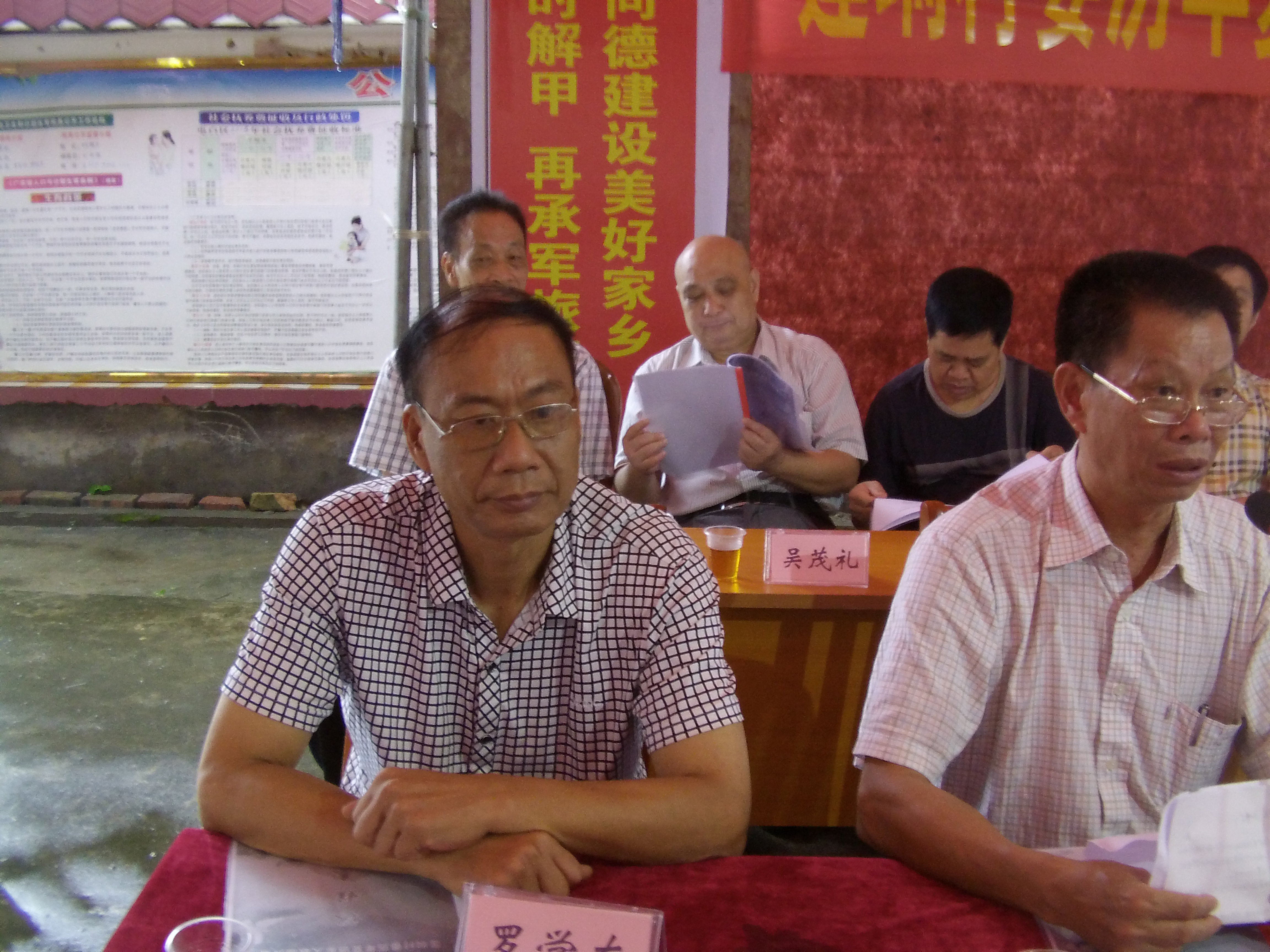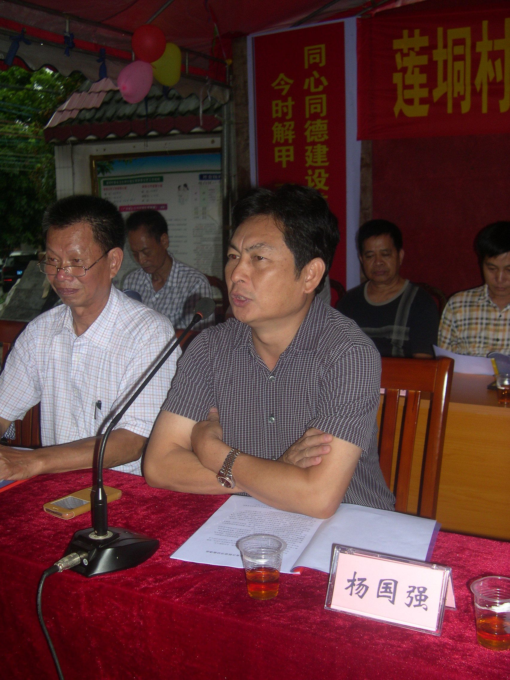 沙琅镇党委委员、常务副镇长吴广辉(左)和莲垌行政村支部书记林荣国(右)在主席台上