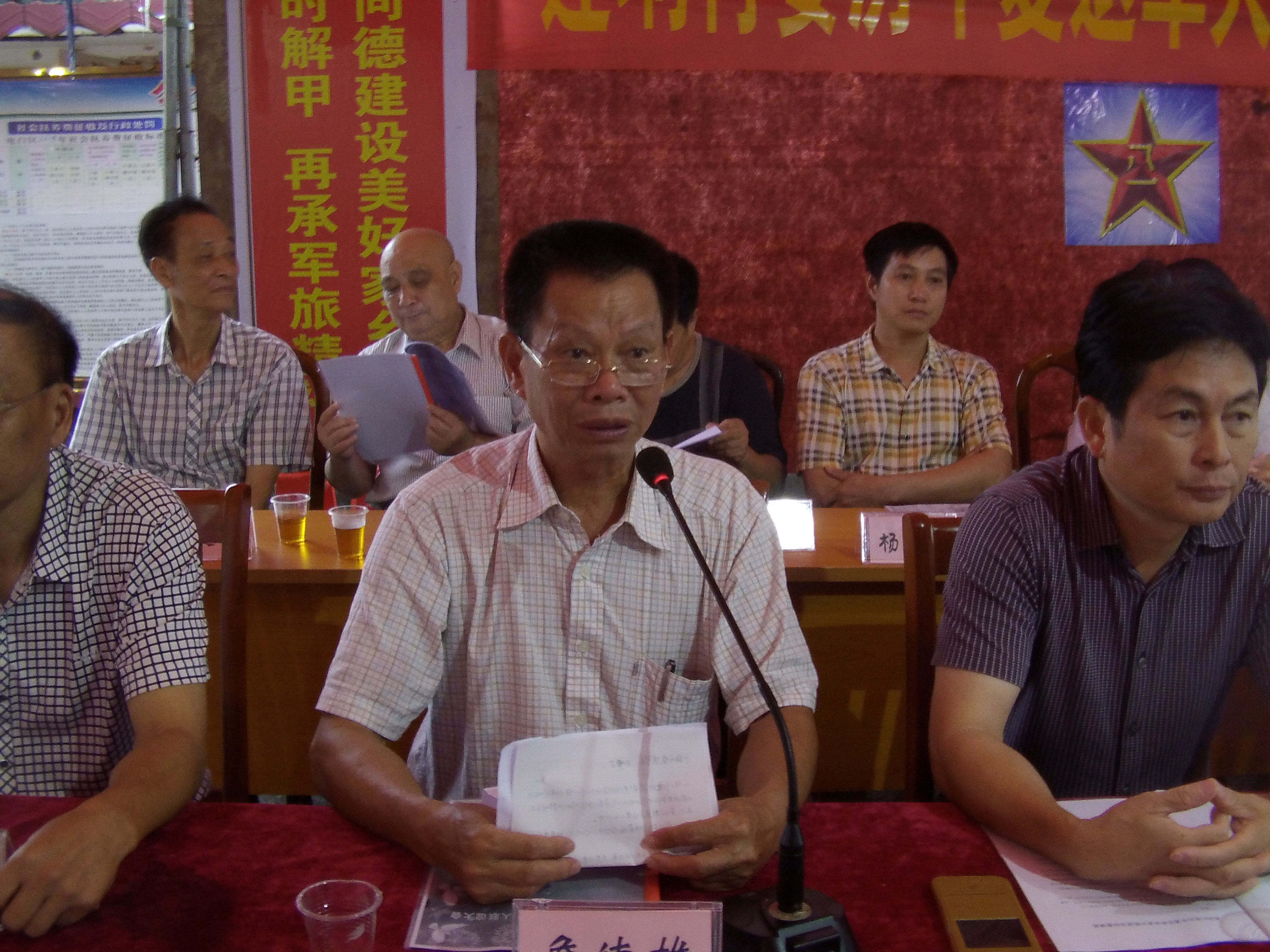 乡贤谢应明先生讲话。谢先生现在是岭南师范学院人文学院党委书记,接到邀请通知后,二话不说,当天一早从湛江驱车回乡与老兵联谊。谢书记在讲话中说:这样的活动很好,村委会干部领导有方,希望乡亲们、老兵们努力建设家乡,既要重武也要重文,要教育好下一代多读书,读好书,学好本领为建设家乡做贡献。