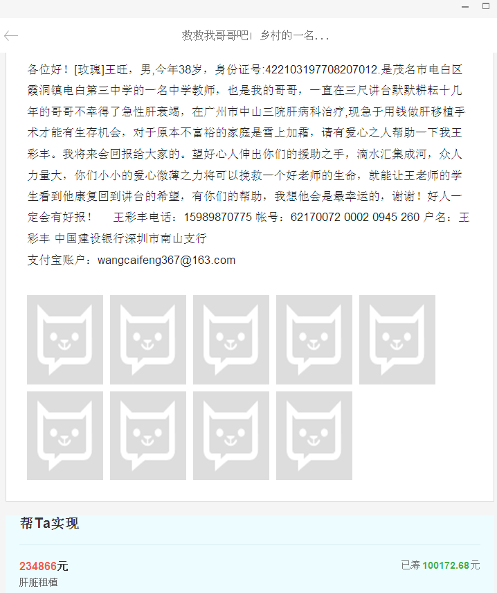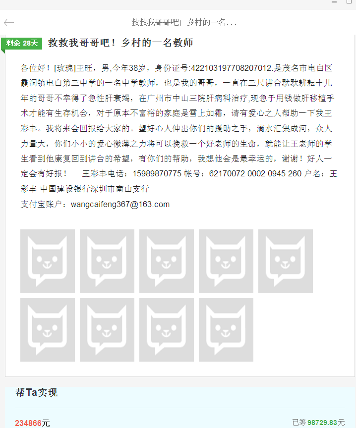 风 风来如我 副教授 注册 2005-05-09 消息 1,860 反馈评分 69 点数 71 年龄 42 2015-10-25 #87 [attachmentid=345287] [attachmentid=345288] 咱用行动告诉大伙,老师不是只会哭工资! 大家都努力伸出援手! 附件 QQ图片20151025200700.jpg 41.9 KB · 查看: 440 QQ图片20151025200813.jpg 50.3 KB · 查看: 447