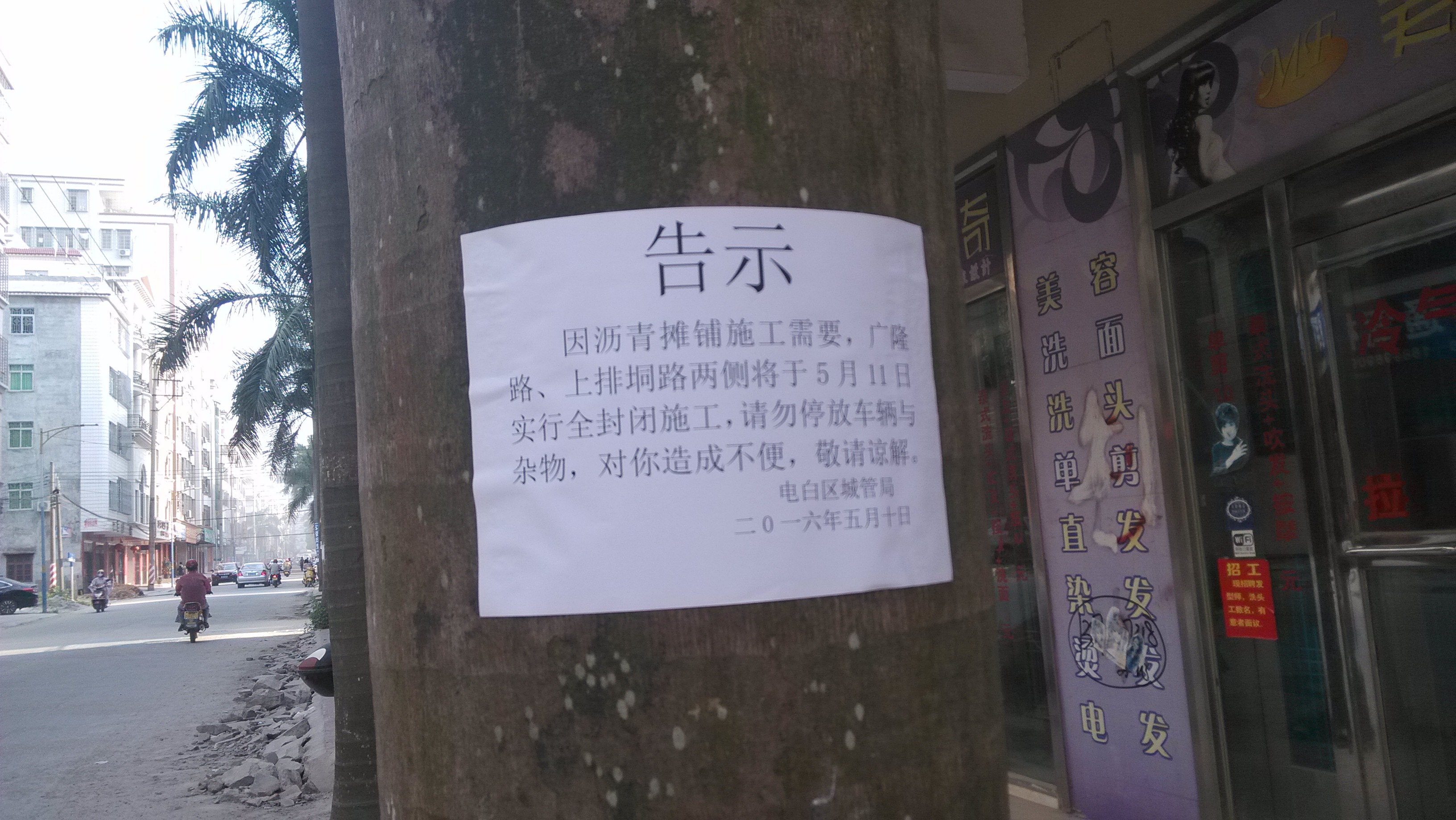 根据要求,明天即(5月11日)从早到晚进行广隆路,上排垌南路沥青铺设工程,届时将分段封闭道路施工(早上7:30~15:00封闭广隆路,16:00至凌晨封闭上排垌南路)敬请广大市民不要在上述路段停放车辆(如有停车将拖走)需要经过上述路段的请绕道行驶,需要在门前摆卖的商户请退缩到室内,对您造成不便敬请谅解!谢谢!