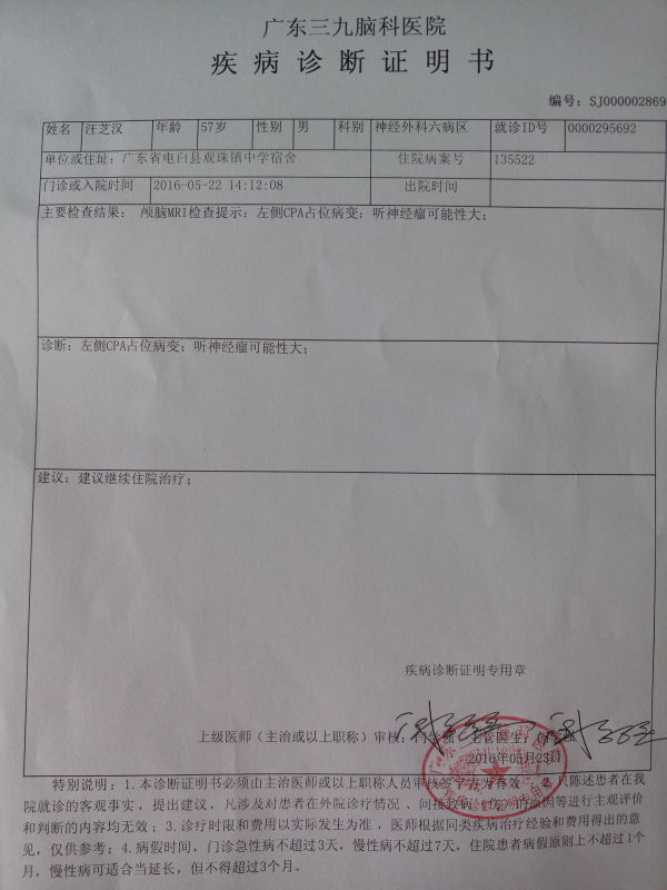广州三九医院今晨再检,诊断:左侧神经瘤可能性大,这与电白检查的结果基本一致。