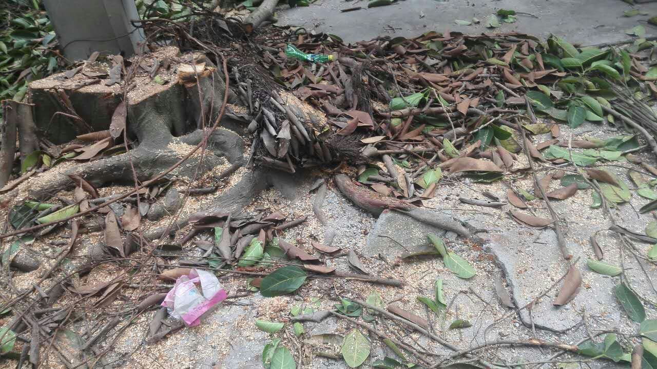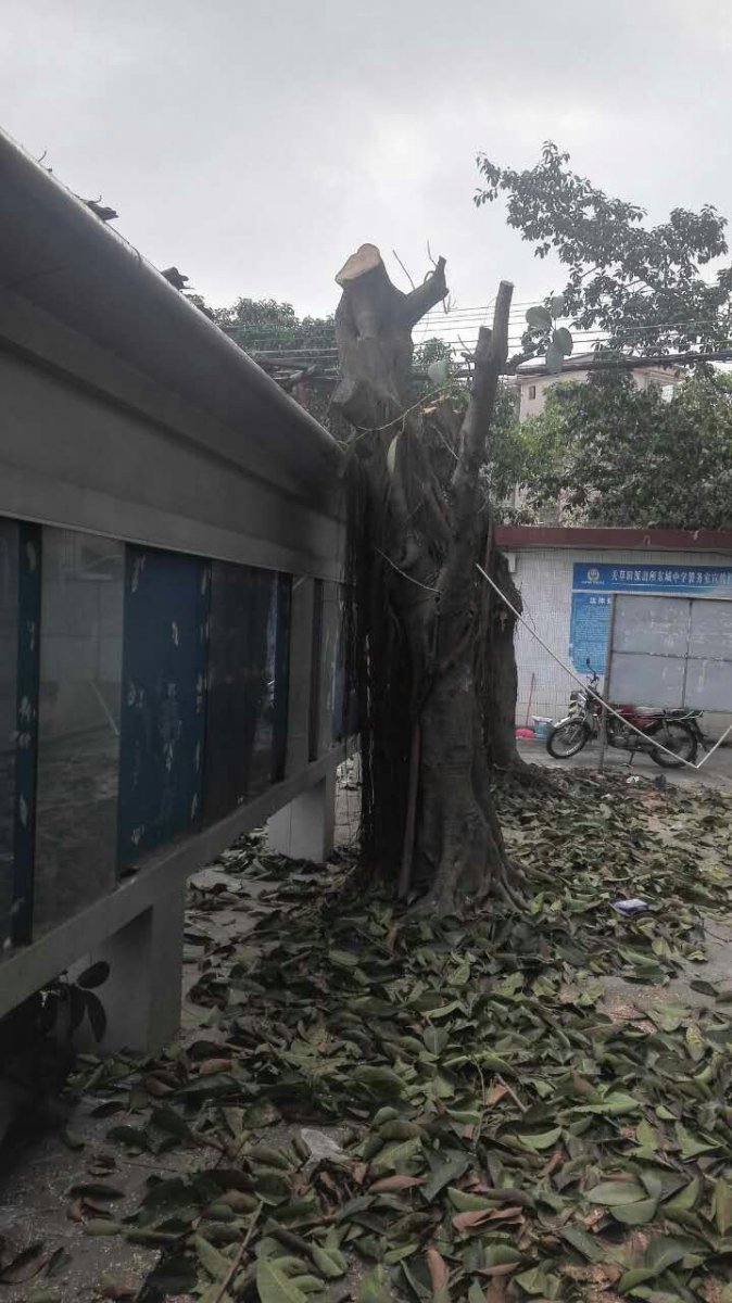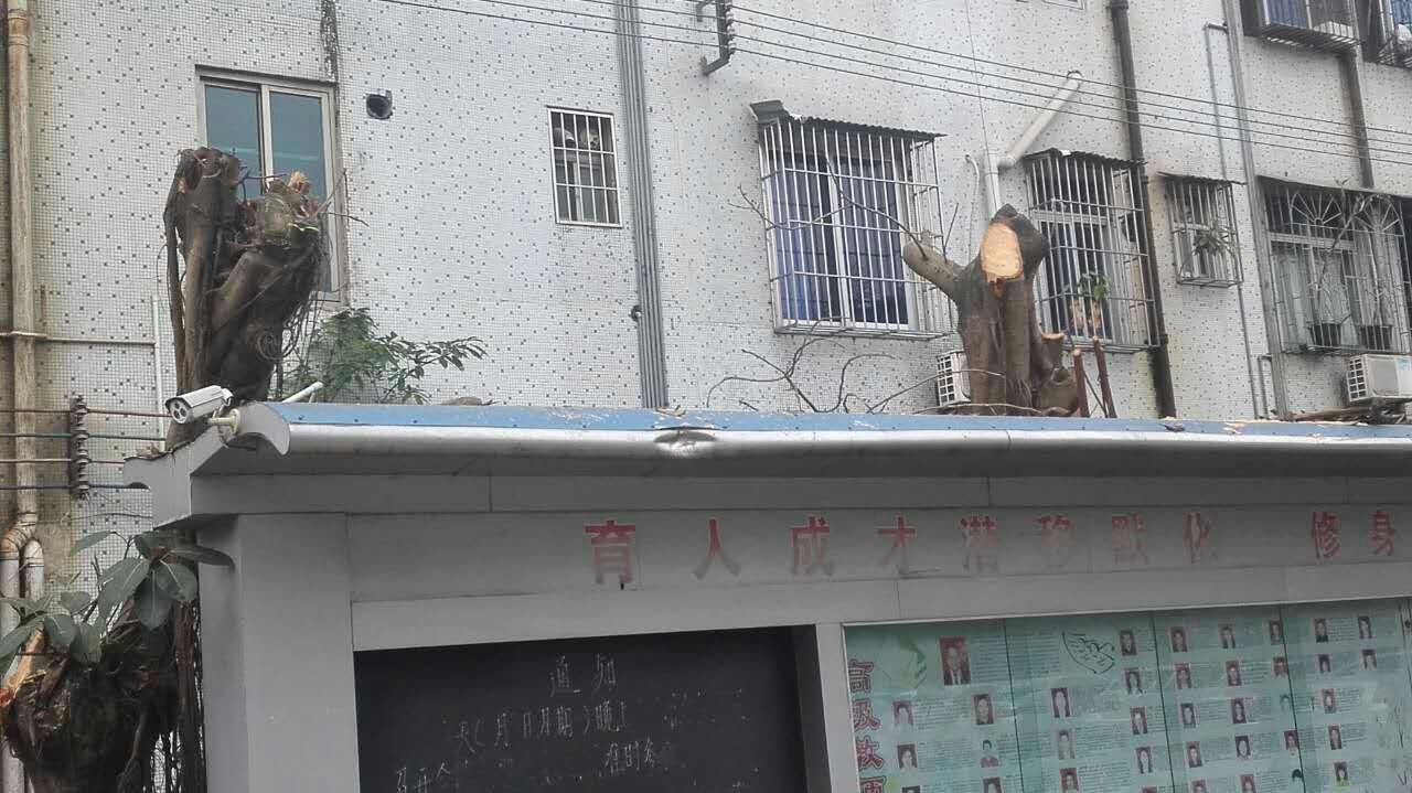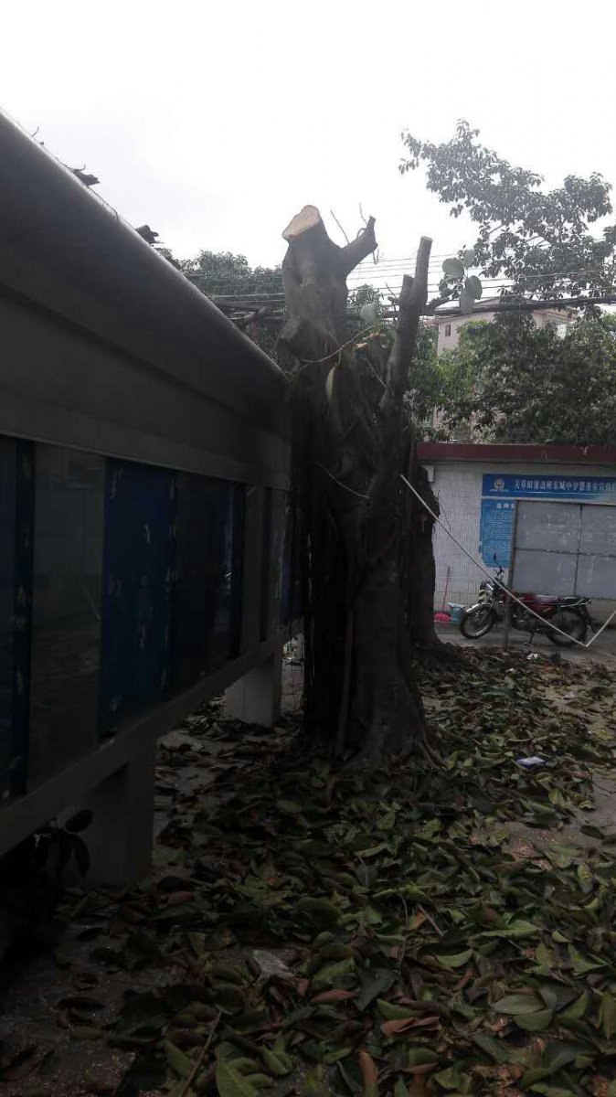 按照茂名市教育局《关于做好2017年校园绿化工作的通知》(茂教勤【2017】3号)文件的要求,我校对威胁楼房、围墙地基、堵塞下水道,破坏宣传栏和绿道的大榕树进行了砍除。消除校园安全隐患,构建和谐安全校园。