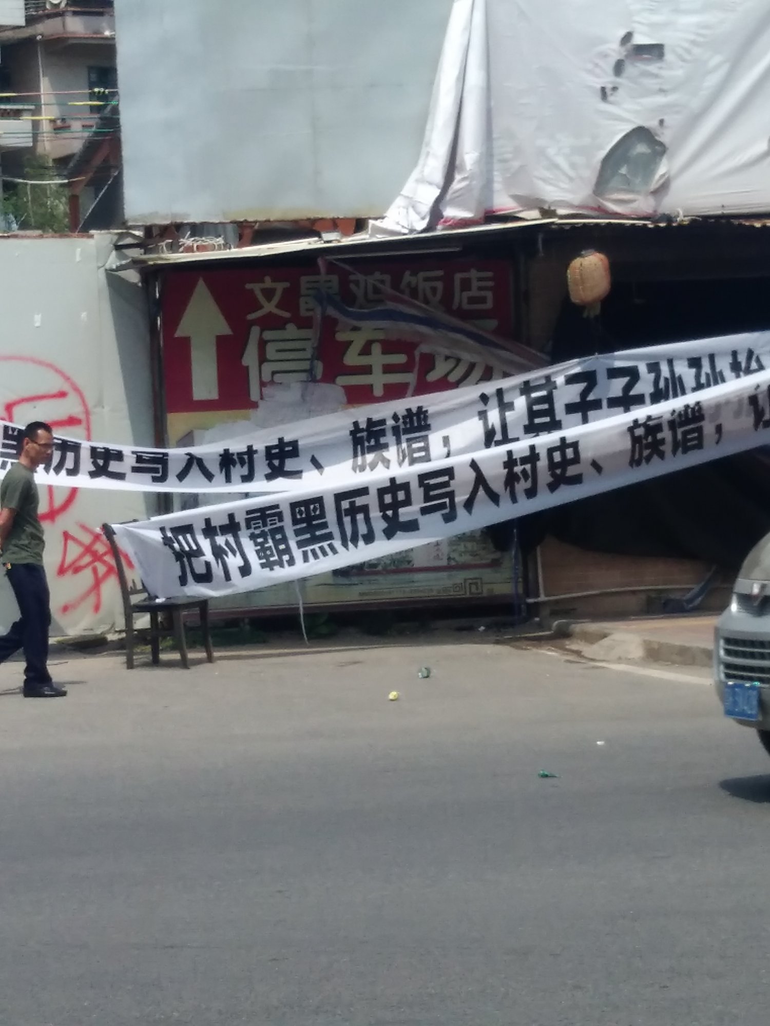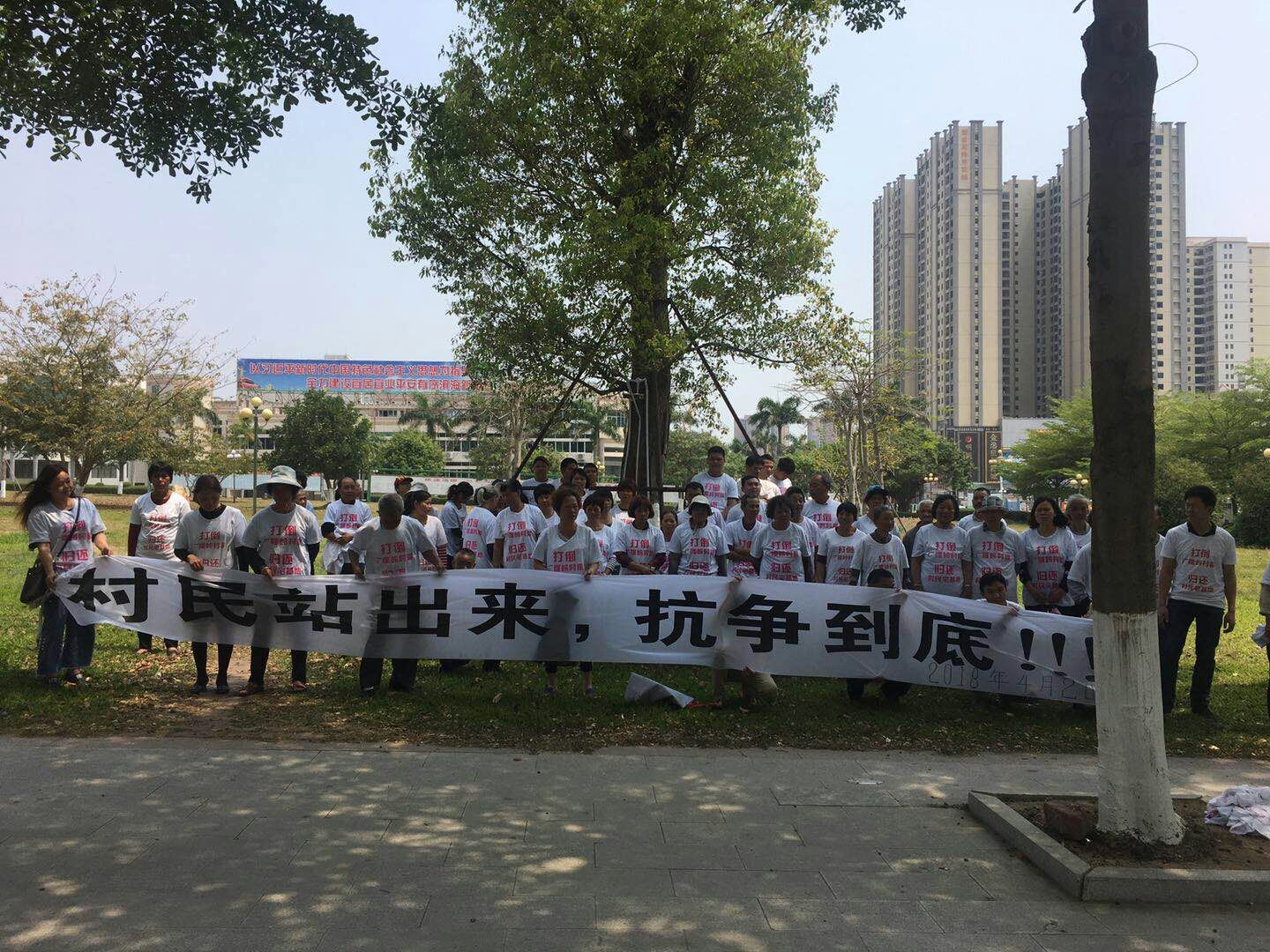 区政府承诺在3月底拆除,村民迟迟未见哪个部门有半点动静,那段时间里村委都跑烂几双鞋了吧。据说当时水东镇林涛书记对村委说是25号前拆除,村民乖乖地等啊等,盼啊盼,等到脖子长了终于等到月尾。或许大家都心中都早已有数,领导不守承诺已是家常便饭的事。每次都跟哄小孩一样,调皮了就给颗糖你尝尝甜头。只会拖字诀愚民对策,当然能拖到换届就是最好的。迫于无奈,村民准备再次到厂前路抗议,可这天上午就有派出所人员来到了村中,看来风声传的挺猛,早早派人来保护村民真是用心良苦。村民们像往常一样过去宅基地处拉横幅抗议,个别警察在周围巡视护航,有人拍到领导都在百米开外的马路对面,难怪迟迟未见他们出现,是心虚还是肾虚众人不得而知。