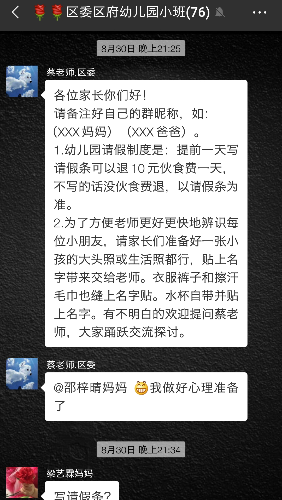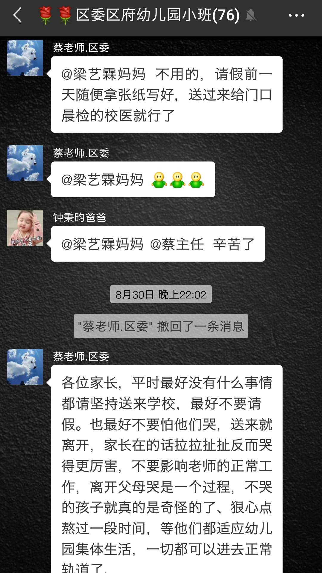 刚才又翻看群消息仔细看,没看到老师回应几位家长。只看到老师在晚上发了明天复课,有位家长把群名改了叫大家改各自备注,这些本来老师应该提醒的,唉……