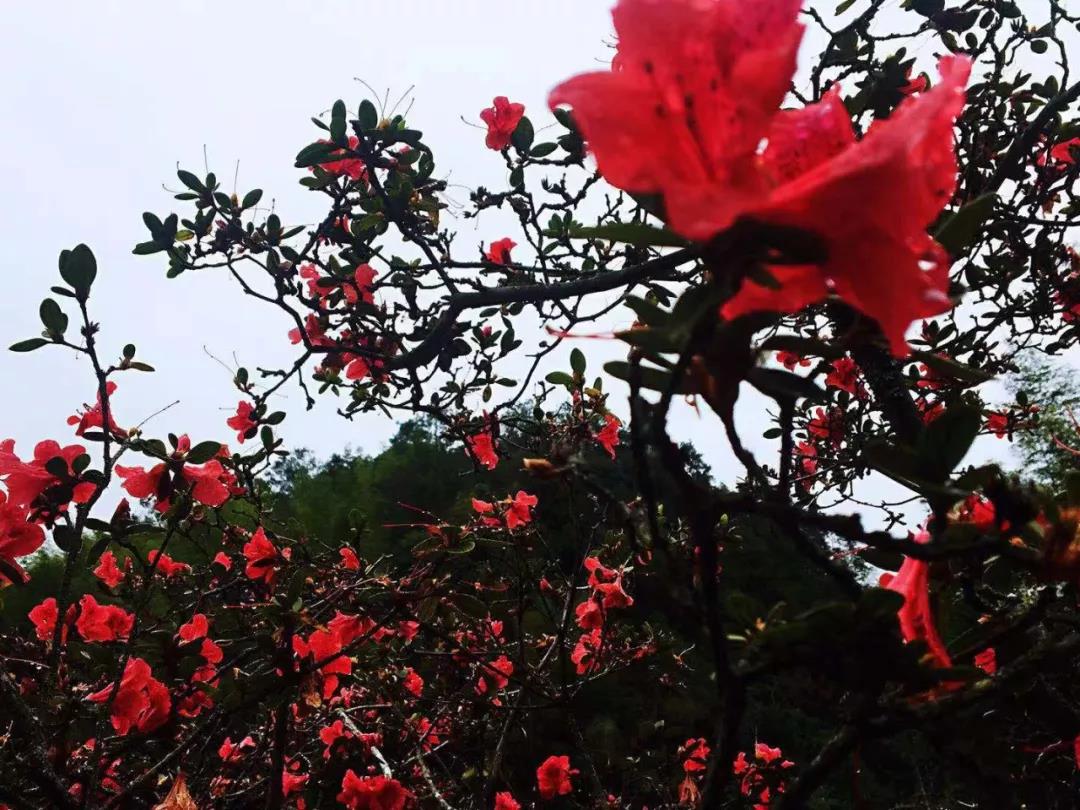 近看则变成了一片缤纷杜鹃海,映得大山都成了彩色。