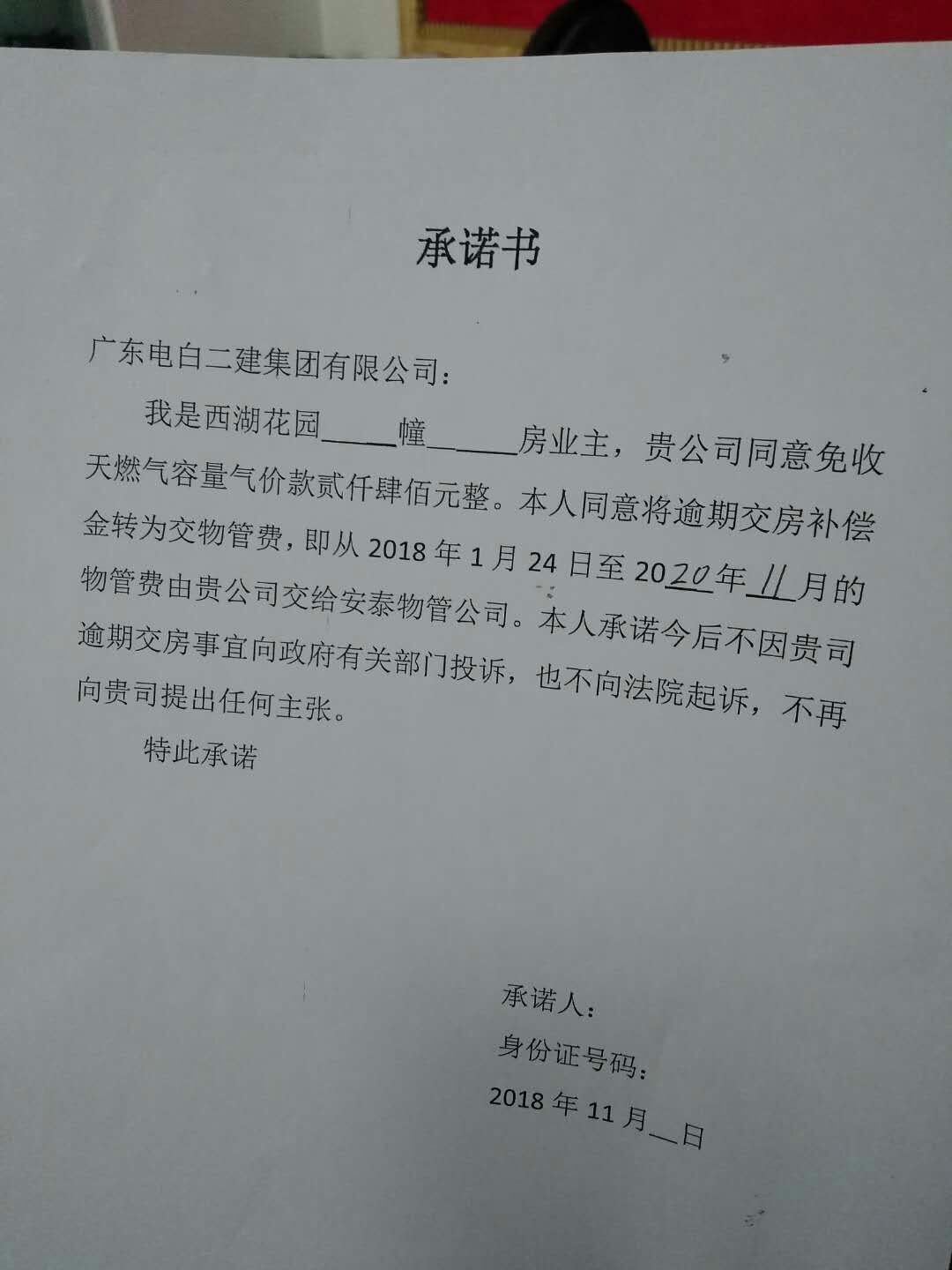 本人在2016年上半年购买由广东电白二建集团有限公司开发的西湖花园商品房,并在当年签署了购房合同并在电白区房管局网签,合同约定在2017年6月30日前交房,时至今日都没有收到开发商正式收房通知书,开发商已经逾期违约了1年多,现在去小区观看目前出现了有些业主入住,听到一些入住业主讲到,当年购房合同签约物业管理公司有更换,电梯由西门子变成所谓的西德西门子,小区配套地下停车位强卖,如果不在开发商处花高价16万人民币购,将无处停放车辆。管道天然气收费2400元1户,电白发改委曾发出通知,商品房售价包含了天然气管道的费用,现在开发商单面收取,投诉到政府部门没没得到处理,