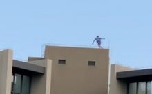 揪心!熊孩子在32楼天台护栏边缘跳跃 玩"吃鸡"游戏