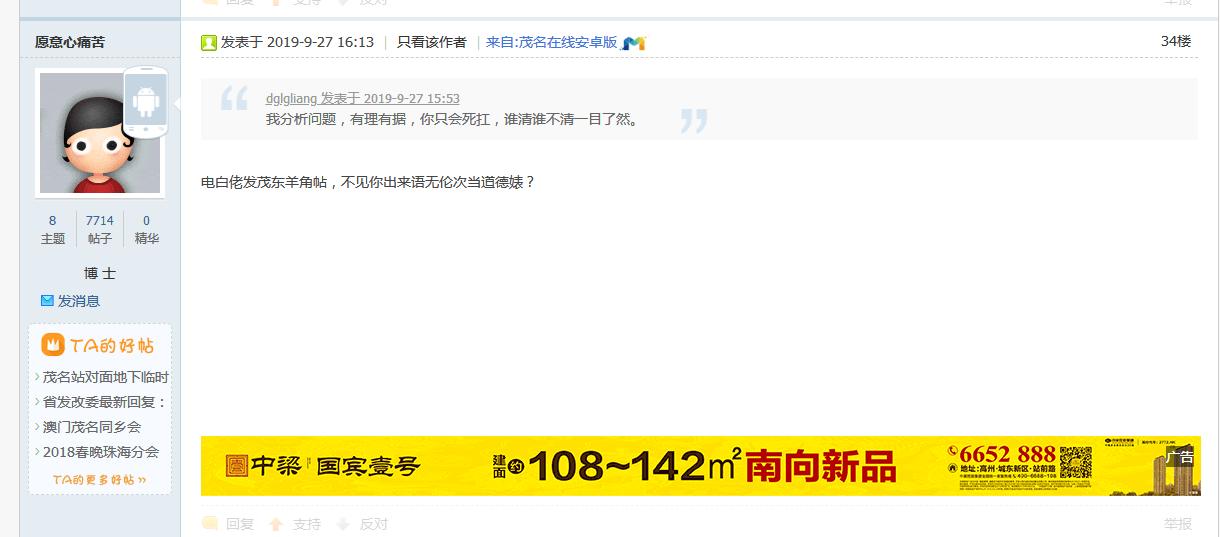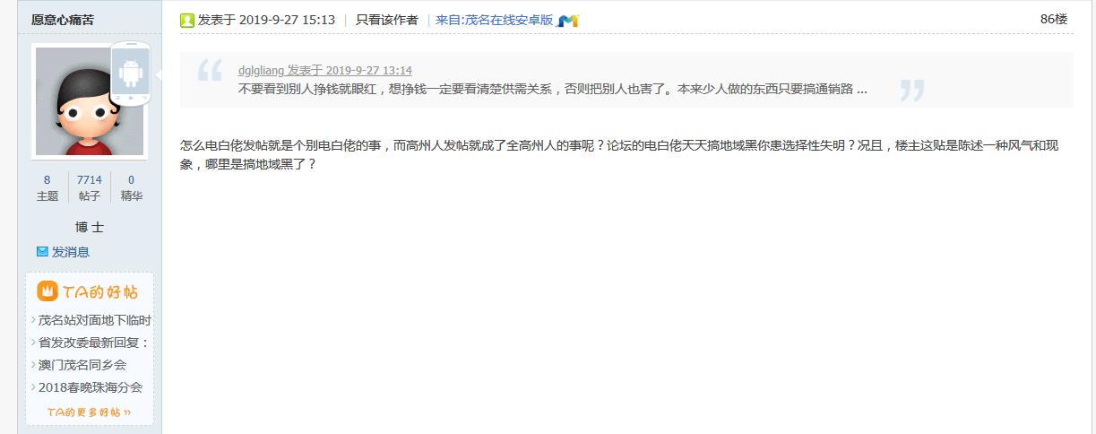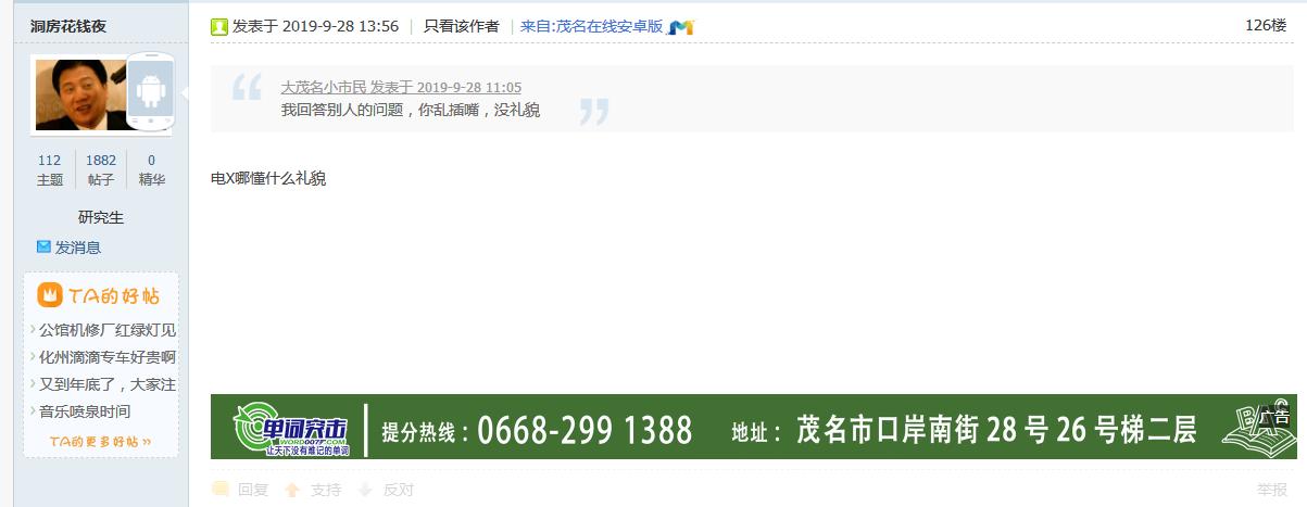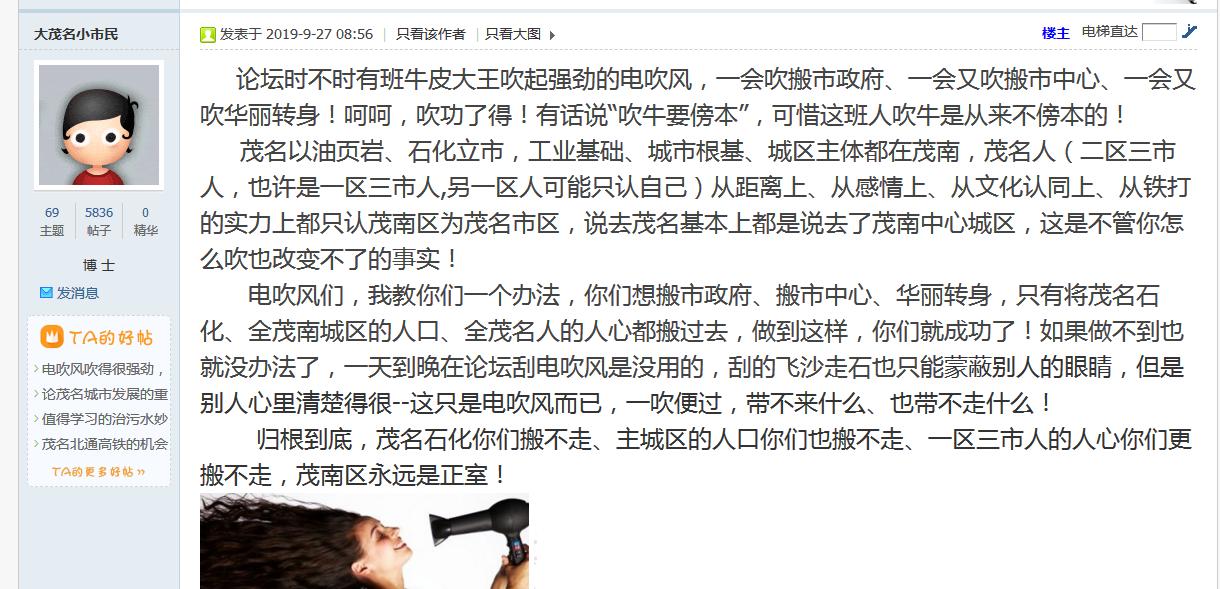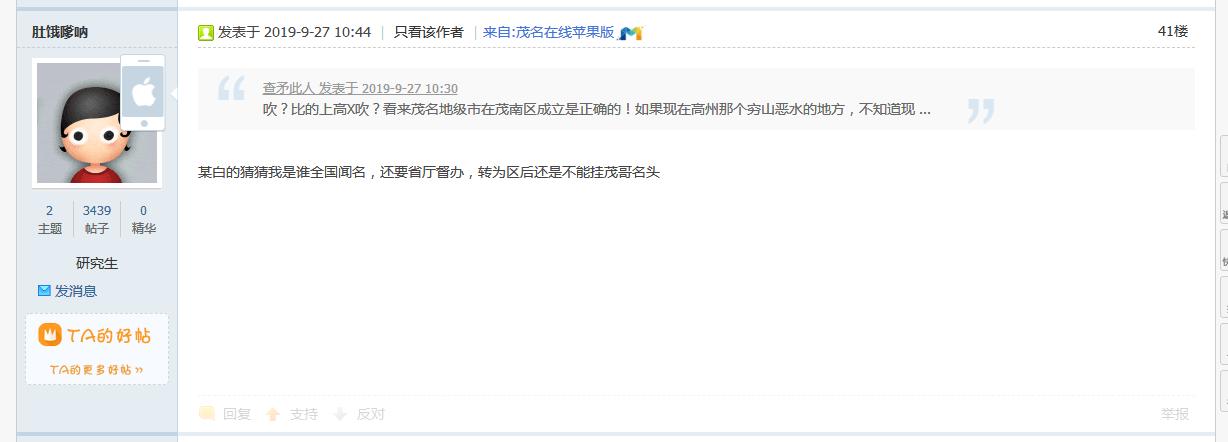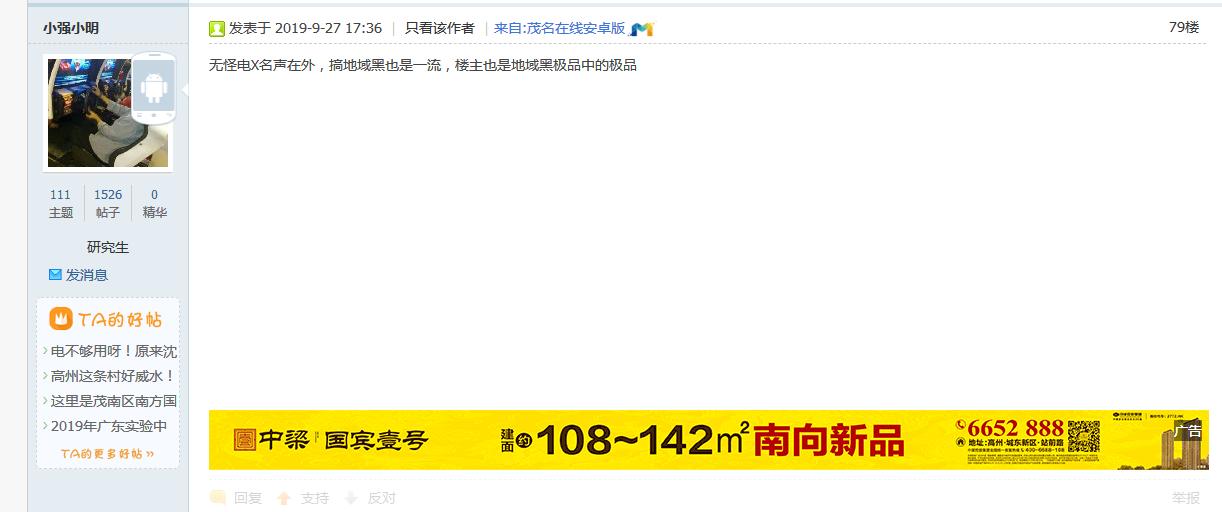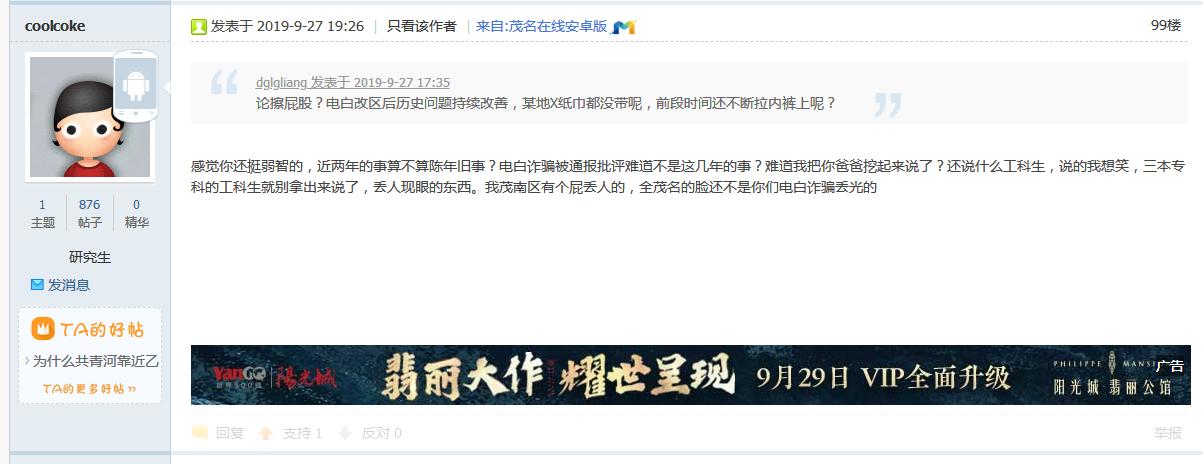 茂名论坛每天就是两件事,1.和湛江佬争高低,2.花式讽刺歧视电白人,已经不看那个弱智论坛了
