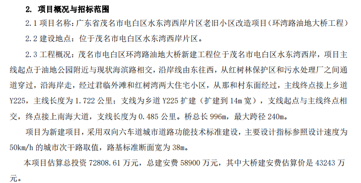 听说博贺湾大桥至水东湾大桥路段今月先行开工?根据规划安排,广东滨海旅游公路电白段按照分步分段实施项目建设,首先实施茂名博贺湾大桥至水东湾大桥路段(简称:先行段),先行段线路起点与在建博贺湾大桥西引道相接,线路走向由东至西基本沿着海岸线走向,途经面前坡、新屋仔、那尾村、山沟南、杨梅村、龙山、邓村、朴村、外海,至水东湾湾口后转折向北,从西葛村西侧跨越青福港,经过青潭尾后继续北走,终点于水东碧桂园东侧接上已建环城东路,线路总长18.65km。该项目采用一级公路标准建设,双向六车道,设计时速60km/h,采用沥青混凝土路面,路基标准断面宽为33.5m,全线共设特大跨海桥梁1座,桥梁总长1086.4m,涵洞28道,线路交叉32处。全线配套建设市政给水管、雨水管、污水管、照明工程及绿化工程,设置养护中心1处,驿站2处。总投资预算约18.9亿元,其中建安费约11.8亿元。