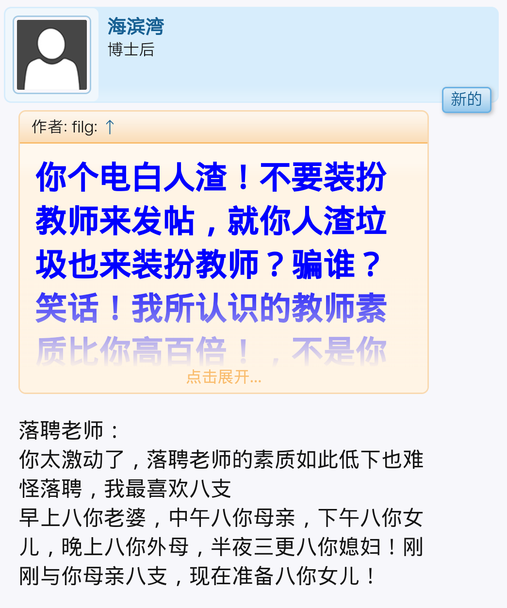 “海滨湾”网友整天污言秽语,有损论坛形象,建议封他ID!(上图为证)