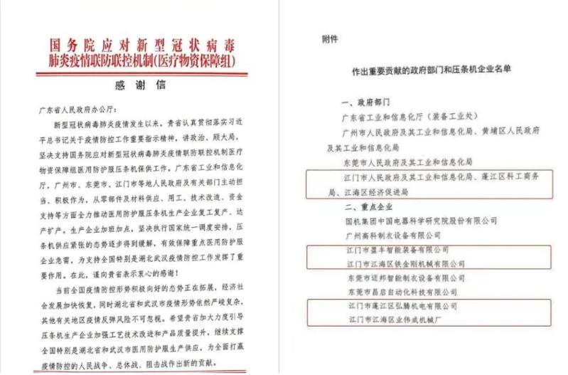 “主动担当、积极作为,从零部件及材料供应、用工、技术改造、资金支持等方面全力推动医用防护服压条机生产企业复工复产、达产扩产。”这段话摘自国务院感谢信,“点赞”的是江门市人民政府及市工业和信息化局、蓬江区科工商务局、江海区经济促进局。
