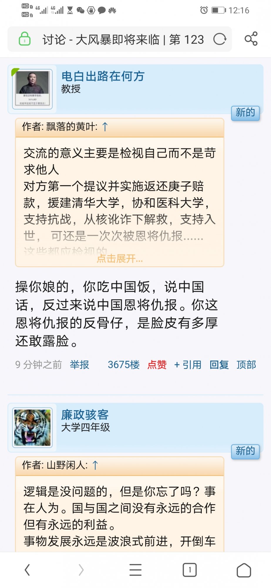 飘 飘落的黄叶 论坛荣誉主席 注册 2008-11-24 消息 9,250 反馈评分 70 点数 71 2020-05-29 #2 飘落的黄叶 说: 大异乡飘零的热帖《大风暴即将来临》里,电白出路在何方因观点相左而粗言秽语相向,请管理员酌情处理,谢谢 浏览附件343007 点击展开...