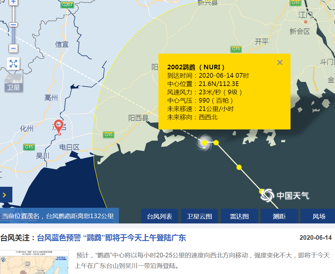 电视台 教授 注册 2020-06-07 帖子 2,511 反馈评分 249 点数 101 2020-06-14 #2 【茂名重大天气报告】 台风“鹦鹉”(热带风暴级,9级)13日22时中心位于距离电白东南方约352公里的南海海面上,预计其将以20公里左右的时速向西北方向移动,强度逐渐加强,将于14日早晨到中午以热带风暴或强热带风暴级在珠海到湛江之间(重点考虑台山到电白)沿海地区登陆。 受其环流影响,14到15日我市有暴雨到大暴雨局部特大暴雨的降水过程。另外,13日夜间至14日我市海面风力逐渐加大到8级到9级阵风11到12级,陆地风力6到7级阵风8到9级。目前全市台风黄色预警信号正在生效,请做好防御工作。茂名市气象台2020年6月13日22时发布