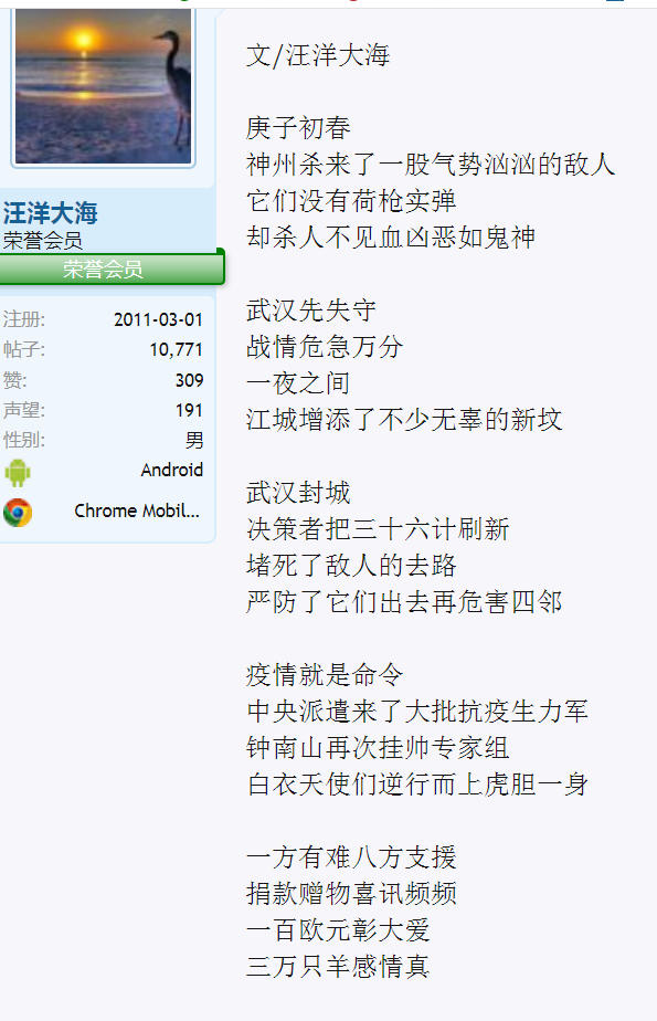 电视台 教授 注册 2020-06-07 消息 2,511 反馈评分 249 点数 101 2020-06-18 #2 汪洋大海,公开出句 , "虎出南山,武汉瘟神 何处躲" ,咒骂武汉是瘟神, 和美国《华尔街日报》骂中国东亚病夫更有过之而无不及。武汉瘟神是一个侮辱中国人的词组,公众论坛上,公开骂武汉瘟神何处躲 ,以为论坛上无人会识破这种汉奸的手法,以为论坛上无人识字,以前也曾用这种手法咒骂救火英雄烈士。 .新冠病毒的源头。现在全世界都没有定论。汪洋大海使用"庚子初春,神州杀来了一股气势汹汹的敌人,它们没有荷枪实弹,却杀人不见血凶恶如鬼神。"汪洋大海不是无知愚蠢,就是故意栽赃陷害。这是一种无耻的汉奸行为。