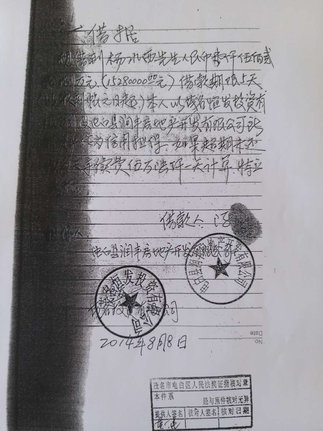 2014年8月8日,陈江以个人名义向杨水西借款人民币壹仟伍佰贰拾捌万元,五天利息28万元,利息率达10.8%(该款项出借人是杨水西,但实际转款人是杨片,杨片的帐户转1100万元给陈江),杨水西与杨片是合作团伙,杨片是沙院镇农民哪来巨款。陈江在全体股东会议不同意其用茂名恒发投资有限公司为其向杨水西借款作担保的情况下,私刻茂名恒发投资有限公司的公章,在其个人与杨水西借款合同(借据)上签名,以茂名恒发投资有限公司作为借款担保人盖章。陈江借到杨水西1528万元后即潜逃了,经查有1000万元陈江又转给钟文友,钟文友也是杨水西团伙串通一起,合谋诈骗茂名恒发投资有限公司。