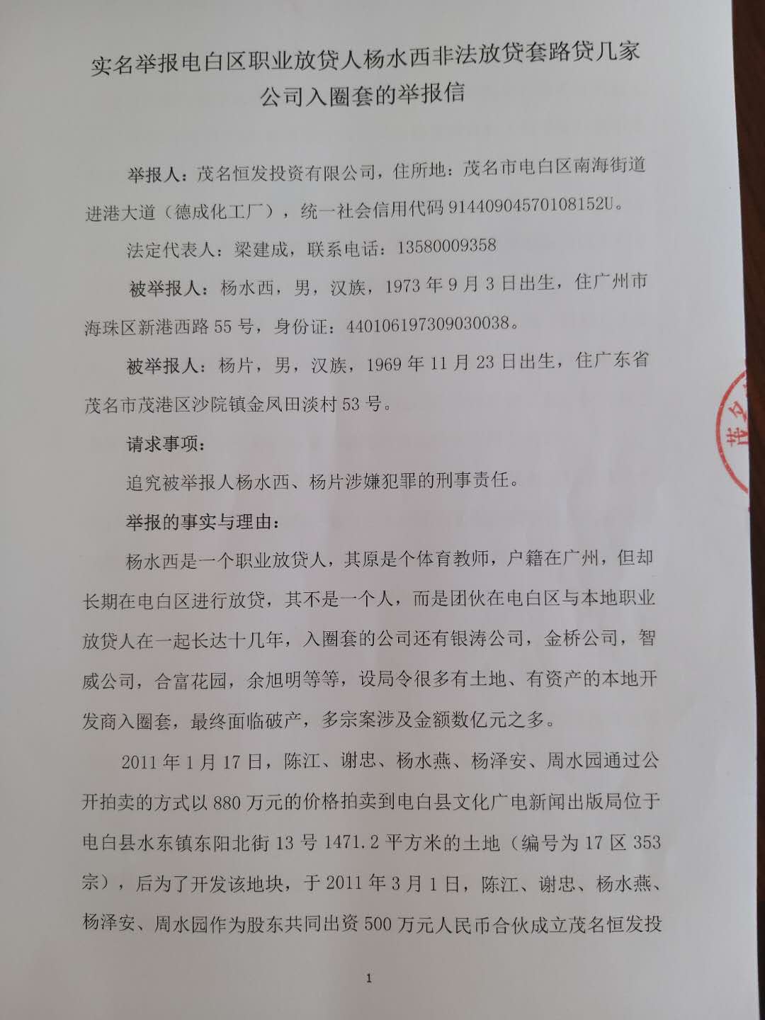 爆料 实名举报电白区职业放贷人杨水西非法放贷套路贷几家公司入圈套的举报信