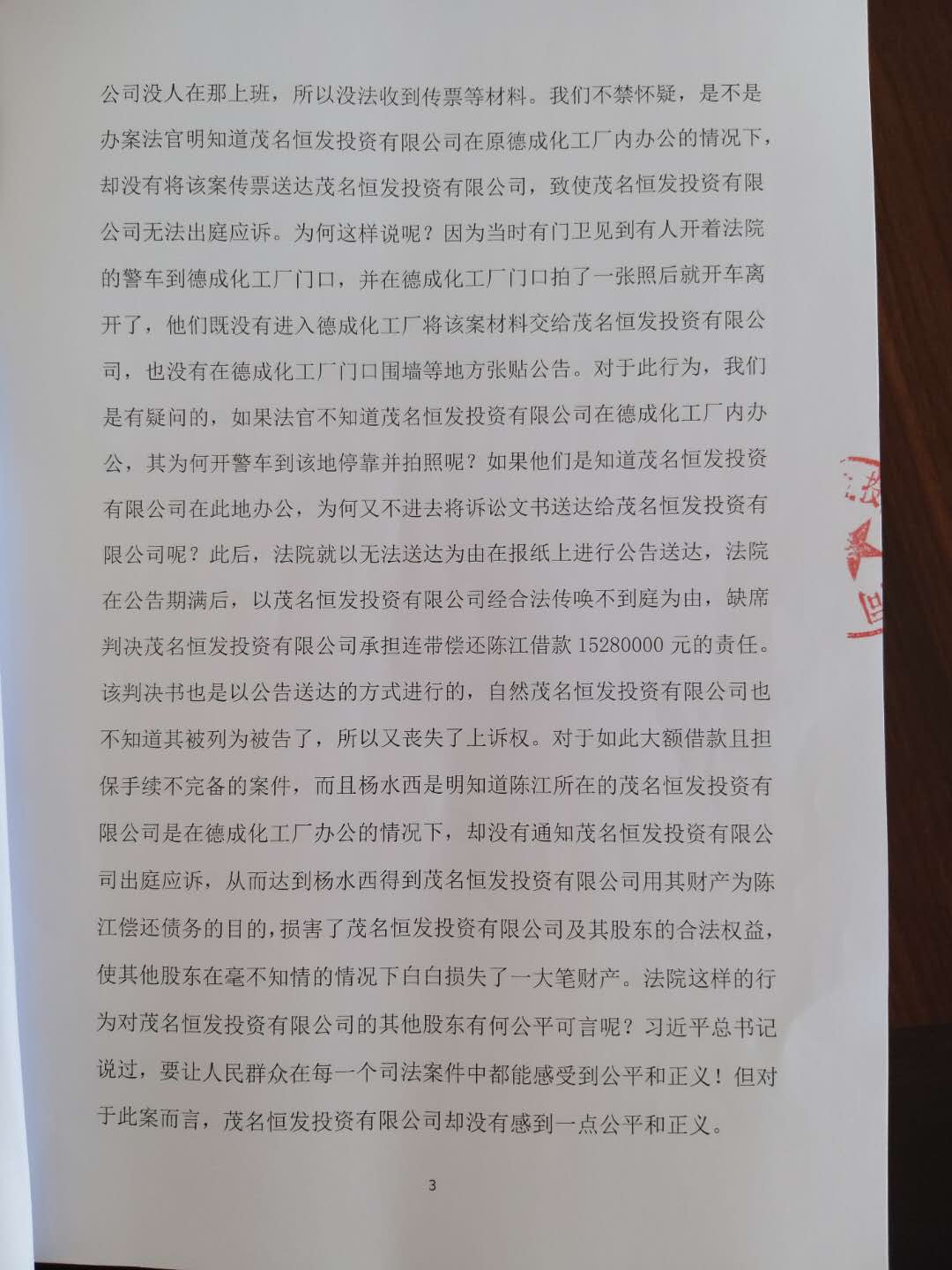 随着陈江的潜逃,茂名恒发投资有限公司和公司股东的厄运就来了。2014年10月20日,杨水西向电白区人民法院提起民事诉讼,起诉请求法院判决陈江归还借款本金壹仟伍佰贰拾捌万元及利息给杨水西,并将茂名恒发投资有限公司列为被告,请求判决茂名恒发投资有限公司承担连偿还款责任。该案诉讼标的本息将近二千万元的大案,主办法官却莫名其妙地做了很多令人不解的行为:该案审理过程中,主办法官在没有通知茂名恒发投资有限公司出庭的情况下就作出了对茂名恒发投资有限公司不利的缺席判决。却没有将该案传票送达茂名恒发投资有限公司,因为当时有门卫见到有人开着法院的警车到德成化工厂门口,并在德成化工厂门口拍了一张照后就开车离开了,以茂名恒发投资有限公司经合法传唤不到庭为由,缺席判决茂名恒发投资有限公司承担连带偿还陈江借款15280000元的责任。该判决书也是以公告送达的方式进行的,自然茂名恒发投资有限公司也不知道其被列为被告了,所以又丧失了上诉权。对于如此大额借款且担保手续不完备的案件,却没有通知茂名恒发投资有限公司出庭应诉,从而达到杨水西得到茂名恒发投资有限公司用其财产为陈江偿还债务的目的,损害了茂名恒发投资有限公司及其股东的合法权益,使其他股东在毫不知情的情况下白白损失了一大笔财产。法院这样的行为对茂名恒发投资有限公司的其他股东有何公平可言呢?习近平总书记说过,要让人民群众在每一个司法案件中都能感受到公平和正义!但对于此案而言,茂名恒发投资有限公司却没有感到一点公平和正义。